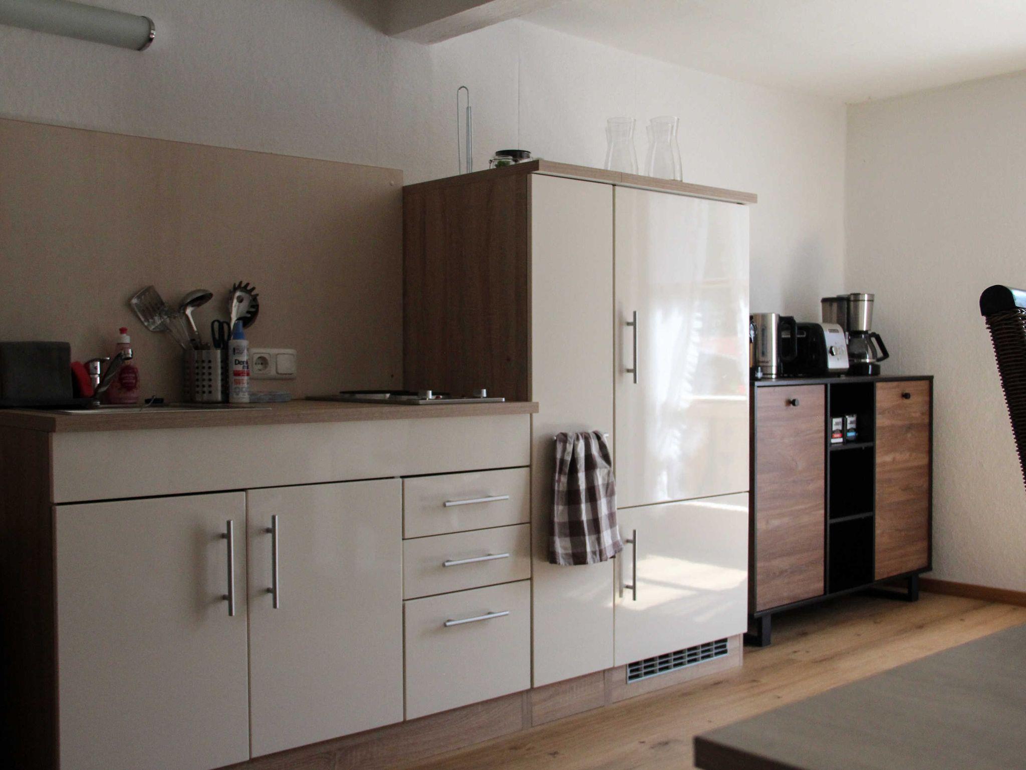 Des Weiteren steht Ihnen eine separate Gemeinschaftsküche mit Sitz- & Essmöglichkeiten zur Verfügung. Ausgestattet ist die Küche mit Herd, Kühlschrank, Kaffeemaschine, Wasserkocher und Toaster. Geschirr, Besteck, Gläser und Töpfe sind ebenso vorhanden.