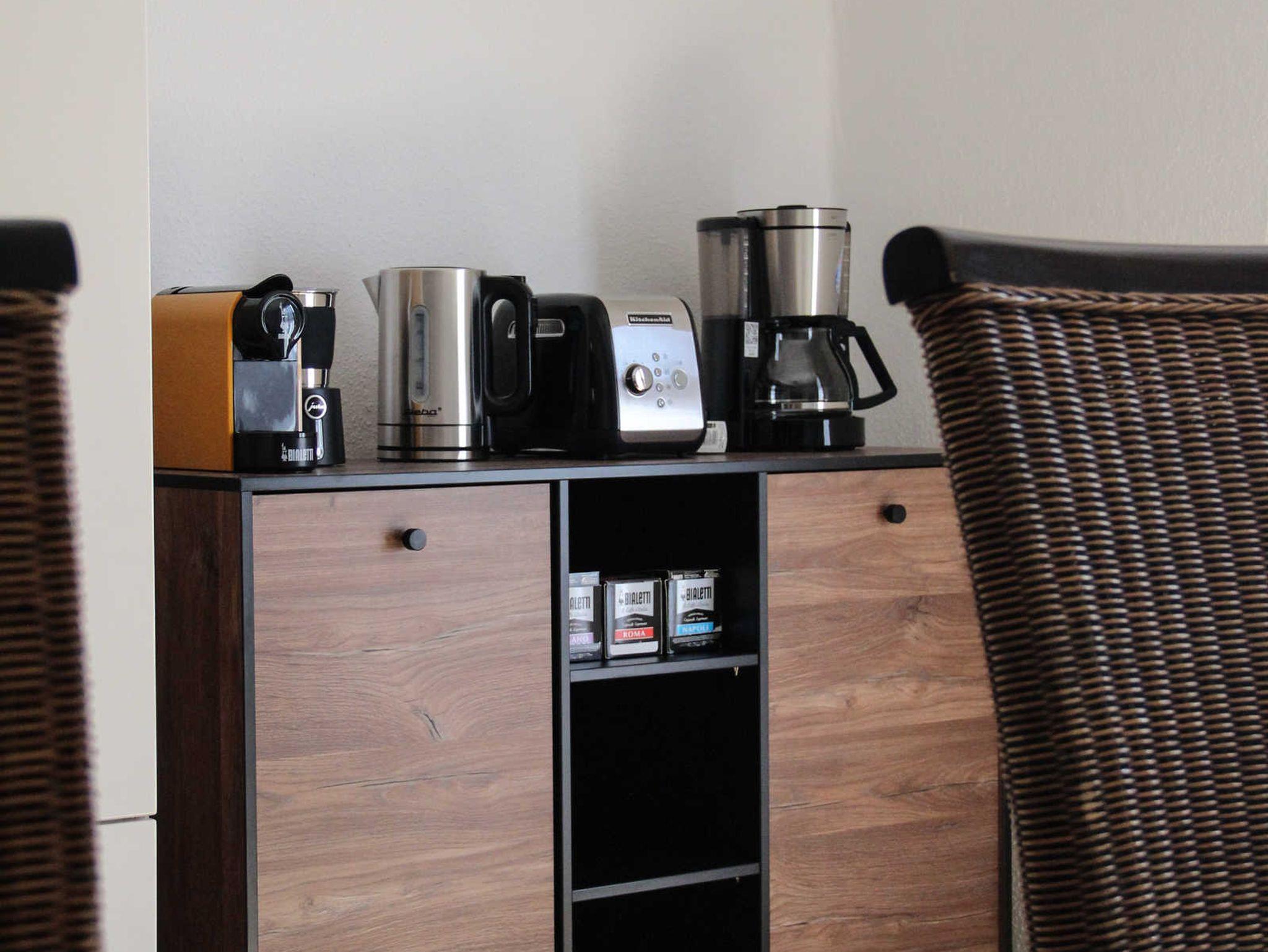 Da wir keinen Frühstücksservice anbieten, steht Ihnen eine separate Gemeinschaftsküche mit Sitz- & Essmöglichkeiten zur Verfügung. Ausgestattet ist die Küche mit Herd, Kühlschrank, Kaffeemaschine, Wasserkocher und Toaster. Geschirr, Besteck, Gläser und Töpfe sind ebenso vorhanden.
