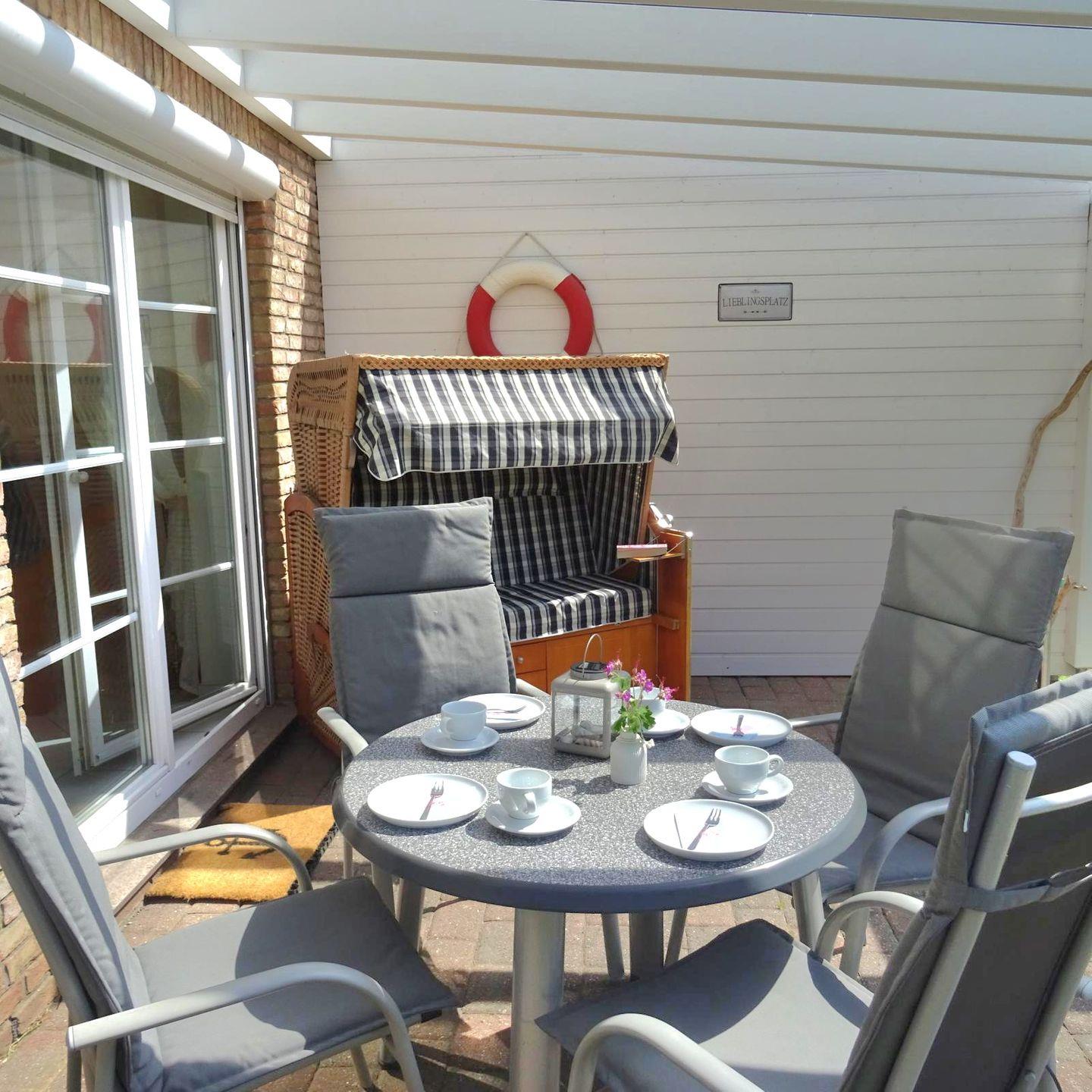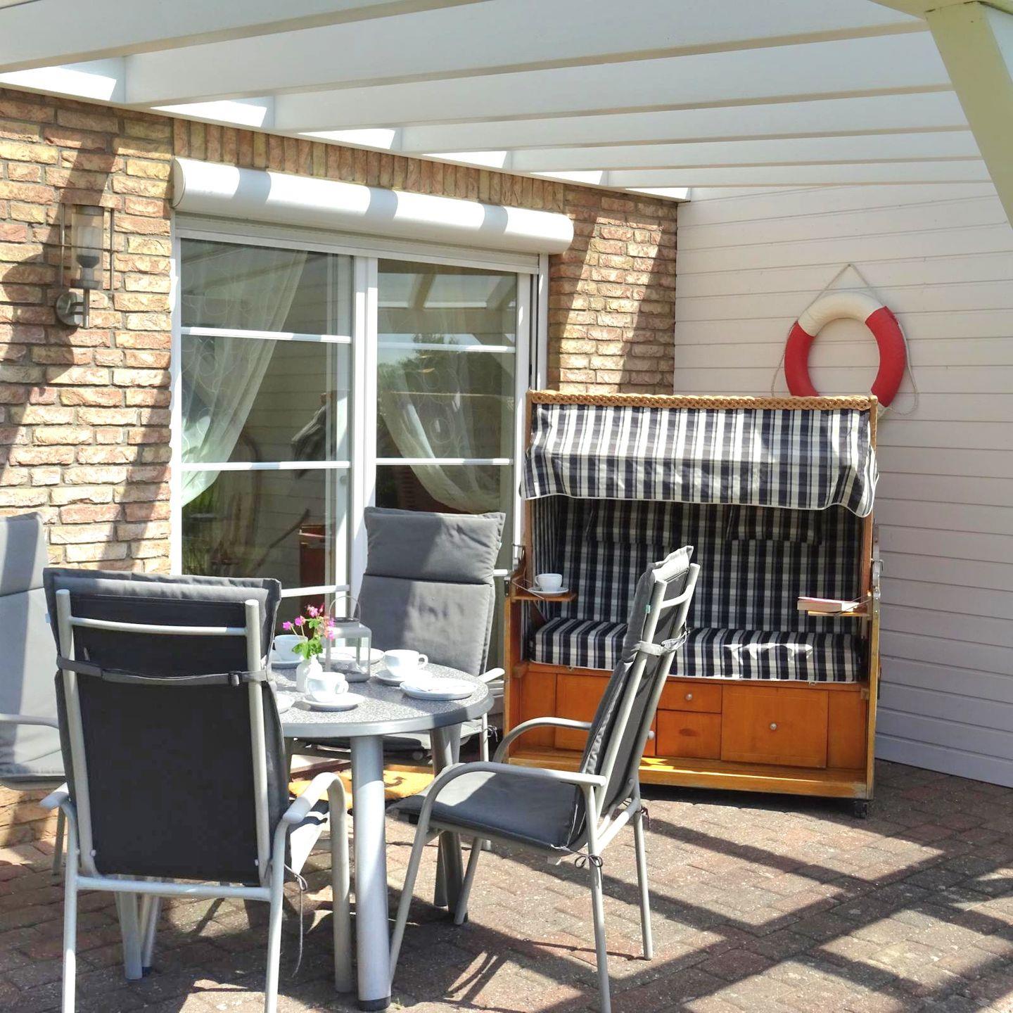 Eine sonnige Terrasse mit Gartenmöbeln, Strandkorb, Markise, Grill und Sonnenliegen garantieren Ihnen schöne Urlaubsstunden.