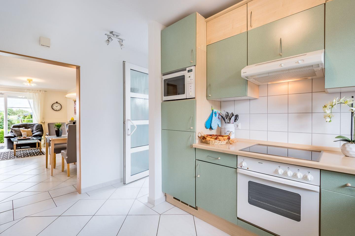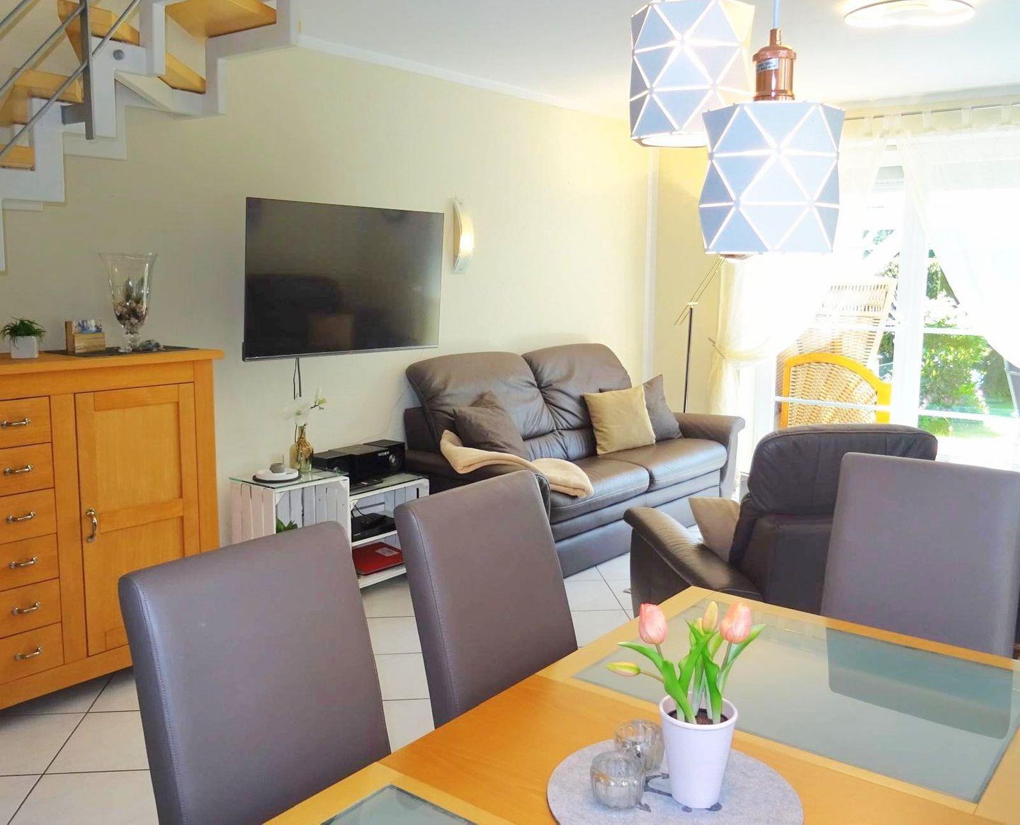 Das Ferienhaus ist für 4 Personen eingerichtet. Die Ausstattung umfasst im EG einen Wintergarten als Eingangsbereich, einen Wohn-/ Essraum mit Kaminofen und Terrassenzugang. Darüber hinaus befindet sich im EG ein Gäste-WC und eine offene Küche mit Geschirrspüler, Ceranfeld/Backofen, Mikrowelle und Kühlschrank.