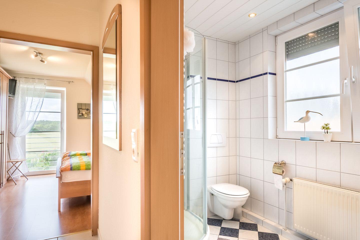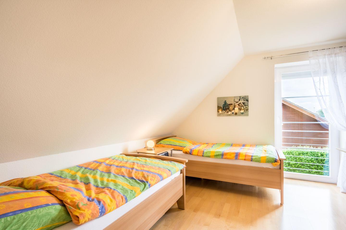 Im OG befinden sich ein Duschbad und 2 Schlafzimmer: Eines mit Doppelbett (180x200cm) und verstellbaren Lattenrosten und ein Schlafzimmer mit 2 Einzelbetten (2x 90x200cm). Die Schlafzimmer können durch Rollladen verdunkelt werden.