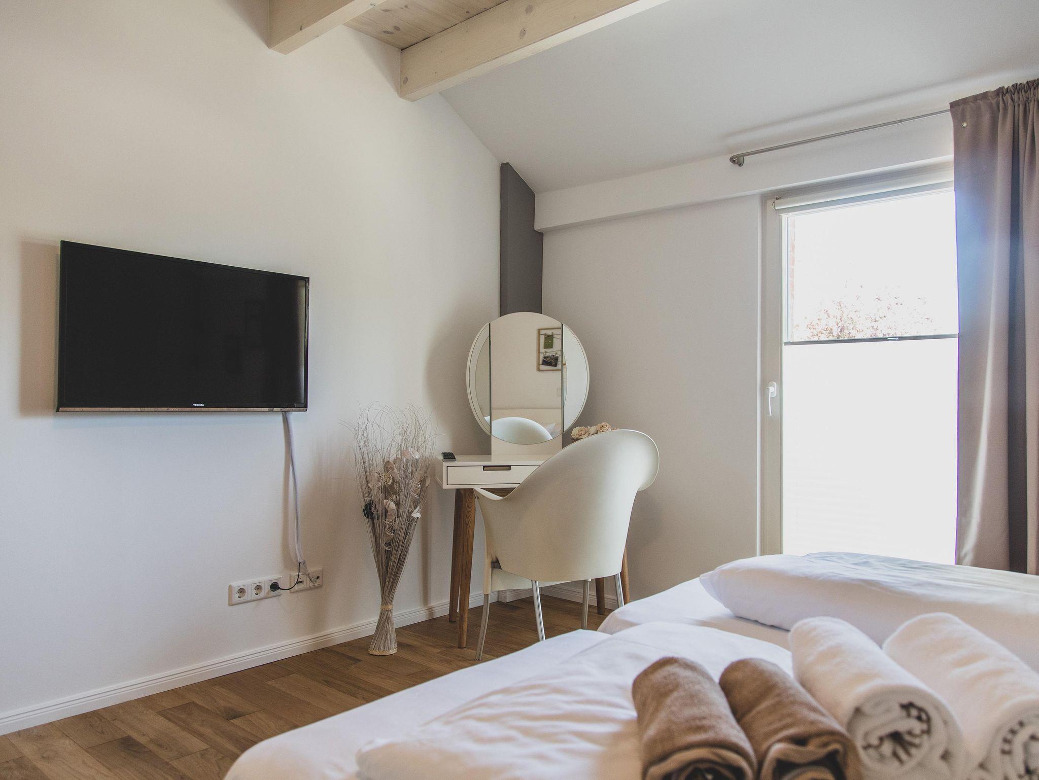 Unsere Wohnungen im Vorderhaus des Ferienhofs verfügen über hohe Decken mit durchgehend erhaltenen alten Deckenbalken. Die historischen Blockrahmenfenster und Fensterläden wurden in Handarbeit neu erstellt und runden den Anblick des denkmalgeschützten Gulfhofs ab. Im ehemaligen Scheunentrakt befinden sich durch bodentiefe Fenster helle und großzügig geschnittene Wohnungen. Alle Ferienwohnungen sind individuell, modern und mit viel Liebe zum Detail eingerichtet und bieten von der Terrasse einen erholsamen Blick auf die Grünflächen mit altem Baumbestand.