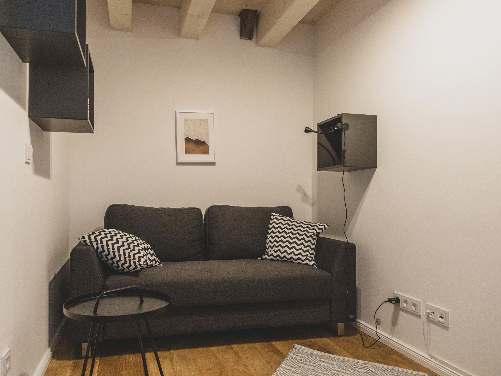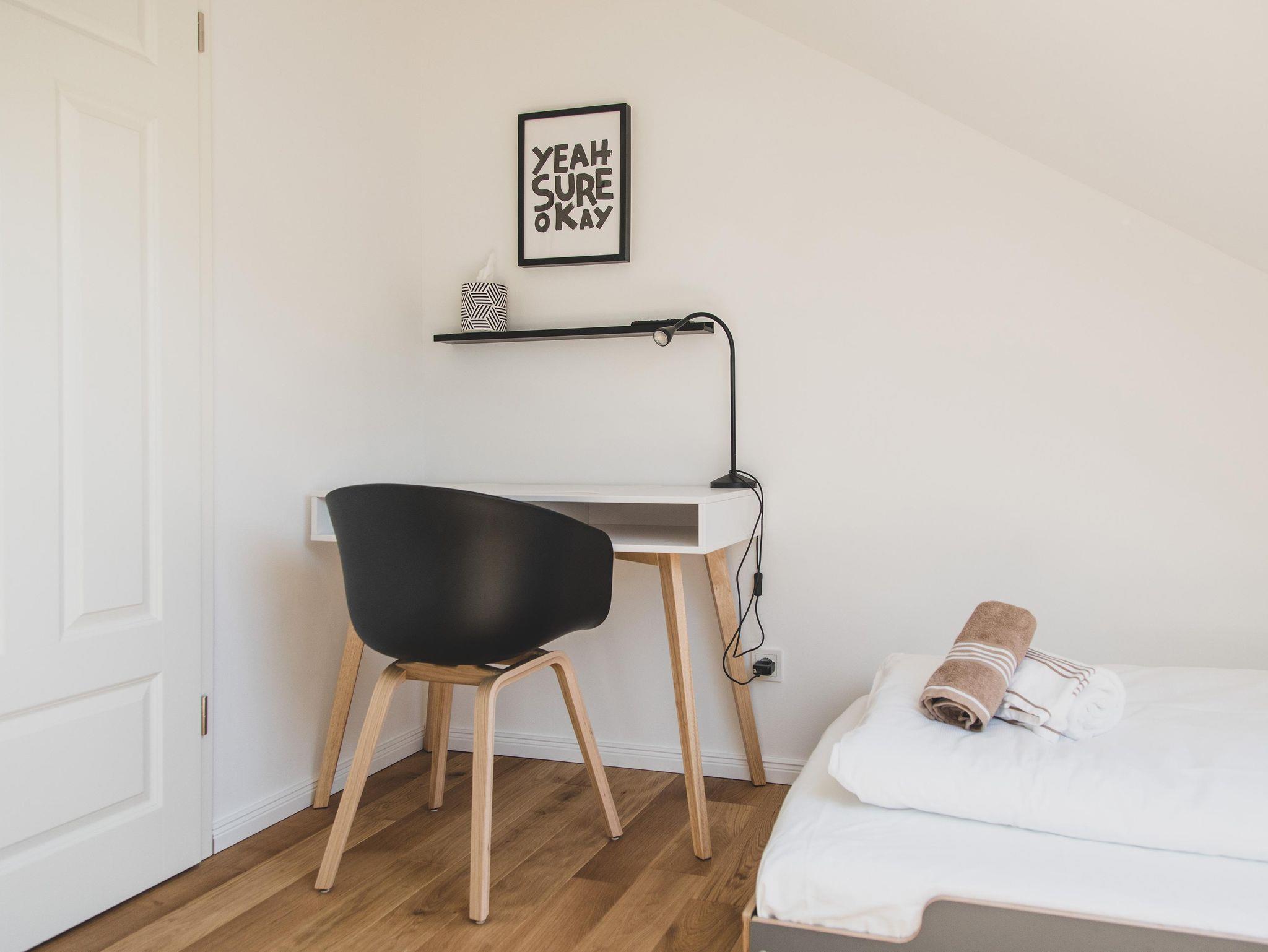 Ein drittes Zimmer, was zur Scheunen-Innenseite ausgerichtet ist, kann als drittes Schlafzimmer (hier findet sich ein sehr hochwertiges Schlafsofa mit Boxspring-Technologie mit einer Liegefläche von 140×200 cm) oder alternativ als Arbeits-, Fernseh- oder Spielzimmer genutzt werden.
