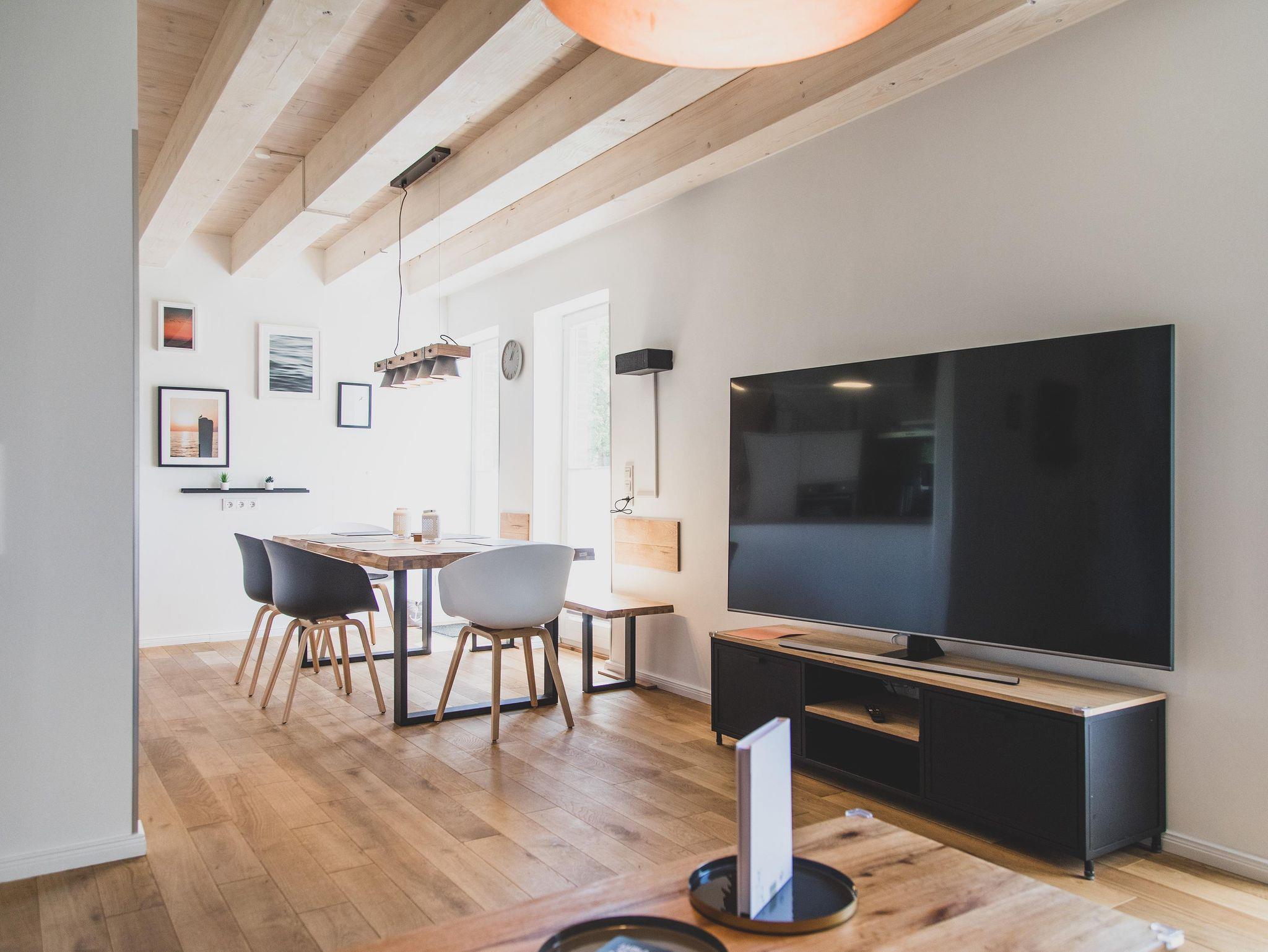 Kochliebhaber über eine voll ausgestattete Küche, einen großen Essbereich und einen gemütlichen Wohnbereich mit einem 75 Zoll Fernseher sowie einer Sonos Musikbox freuen. Auch befindet sich hier ein Gäste WC und ein großzügiger Abstellraum.