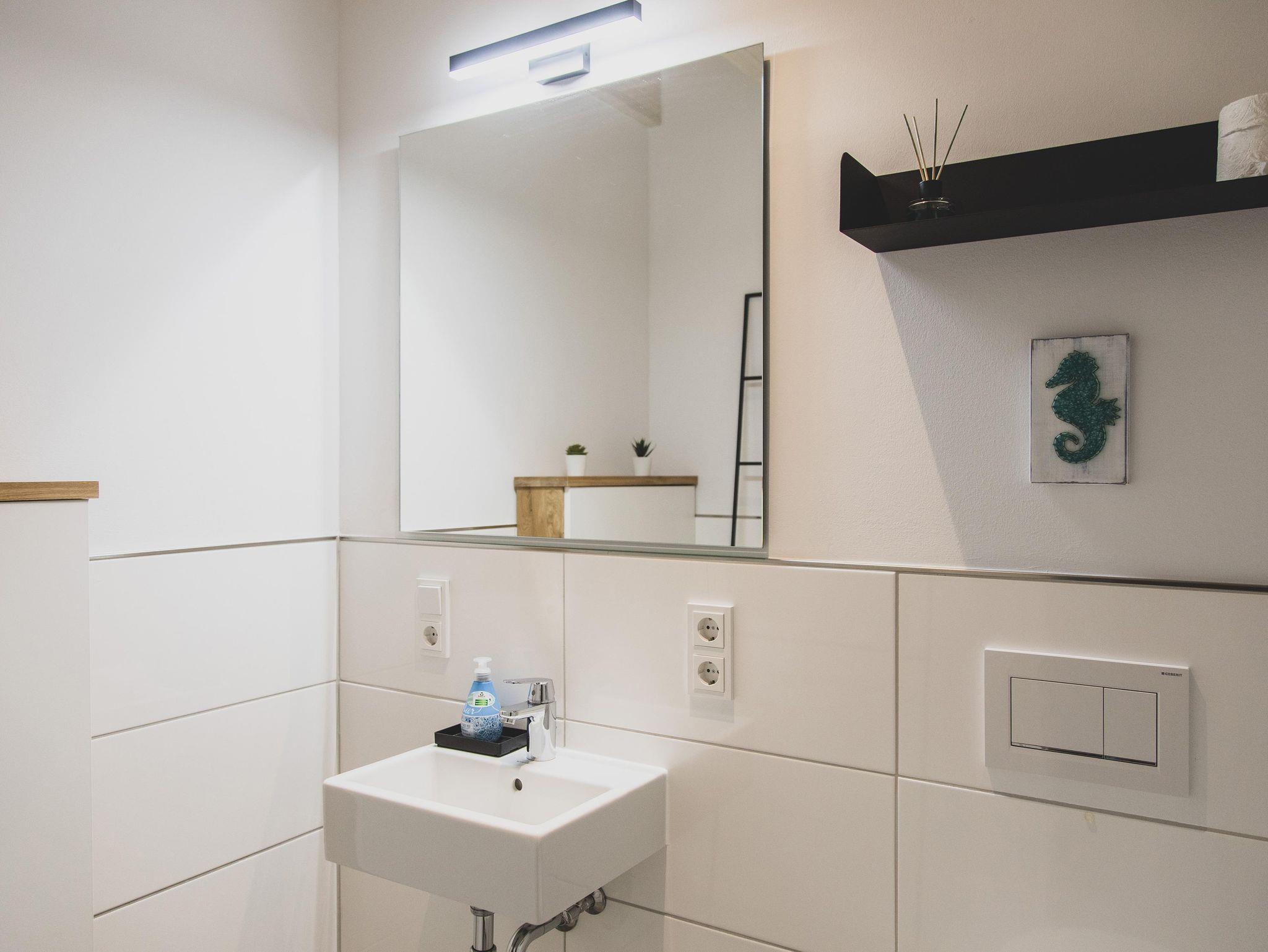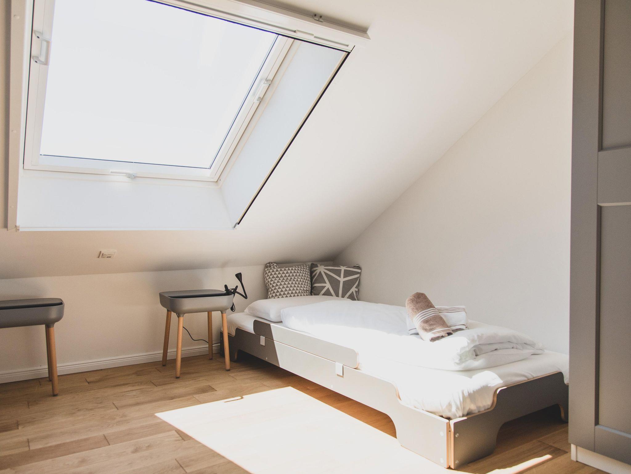Zusätzlich verfügt die Wohnung über einiges an Kinderausstattung, u.a. Kinderhochstuhl, Kinderreisebett mit extra Schaumstoffmatratze, Rausfallschutz für eines der Einzelbetten, Baby-Badewanne, Kindergeschirr, Treppensicherung (sowohl unten als auch oben an der Treppe), Nachtlichter.