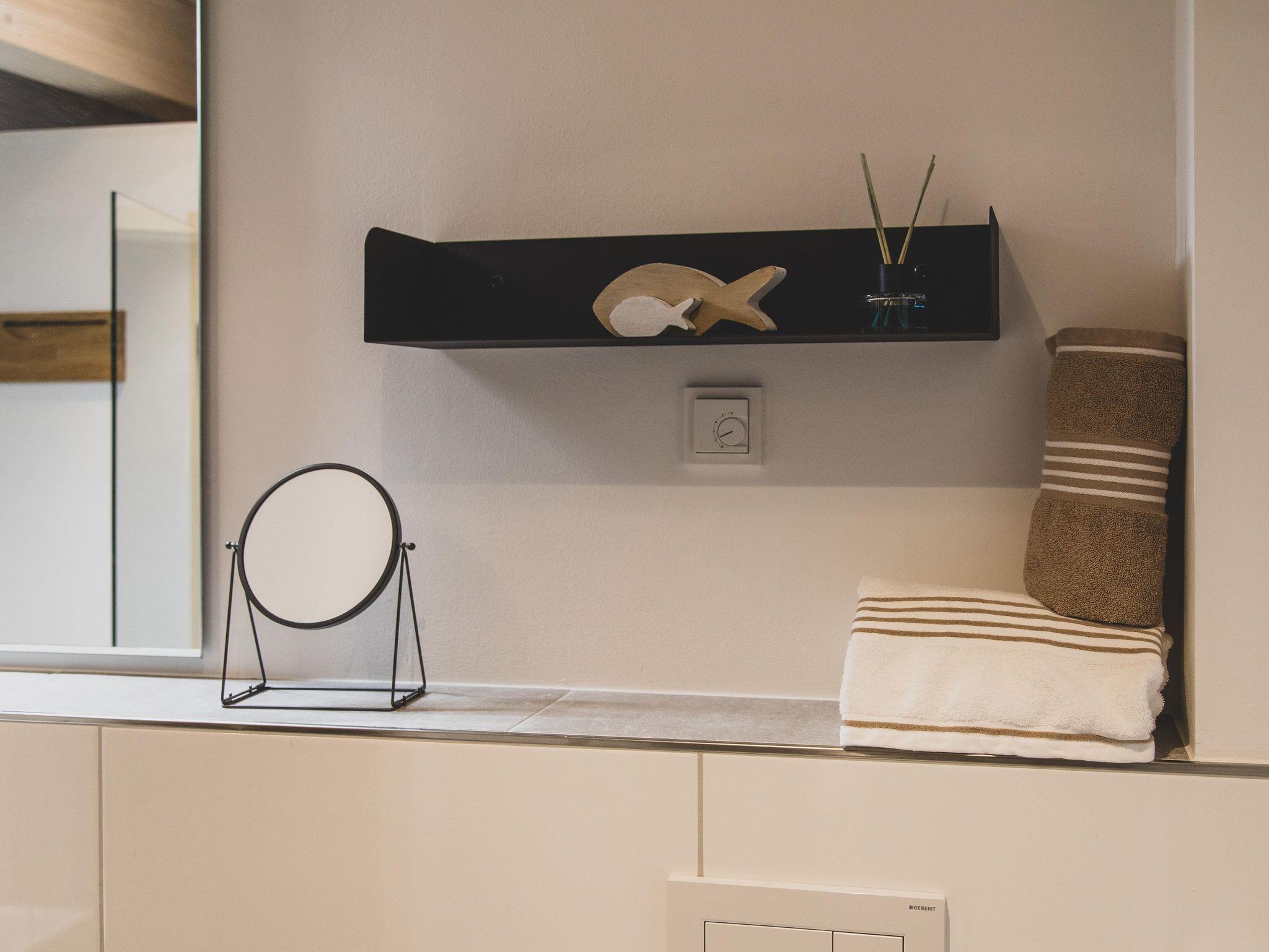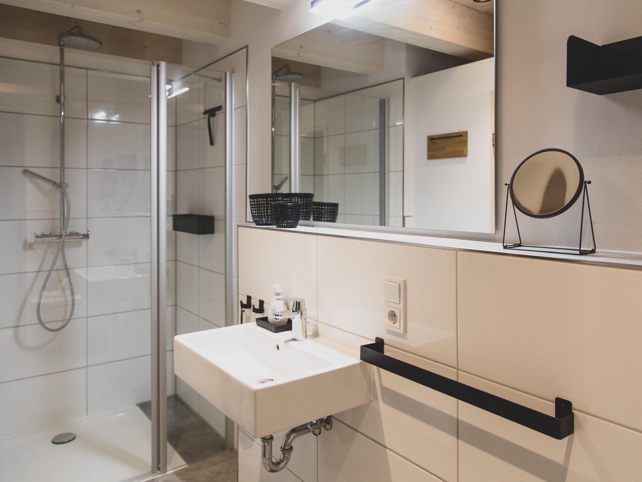 Des Weiteren findet sich – auch mit Blick in das Scheunenatrium – ein Badezimmer mit großzügiger Dusche und einer finnischen Sauna, die Platz für 2 Personen bietet. In das Badezimmer ist auch einer der denkmalgeschützten Träger des Ständerfachwerks integriert.