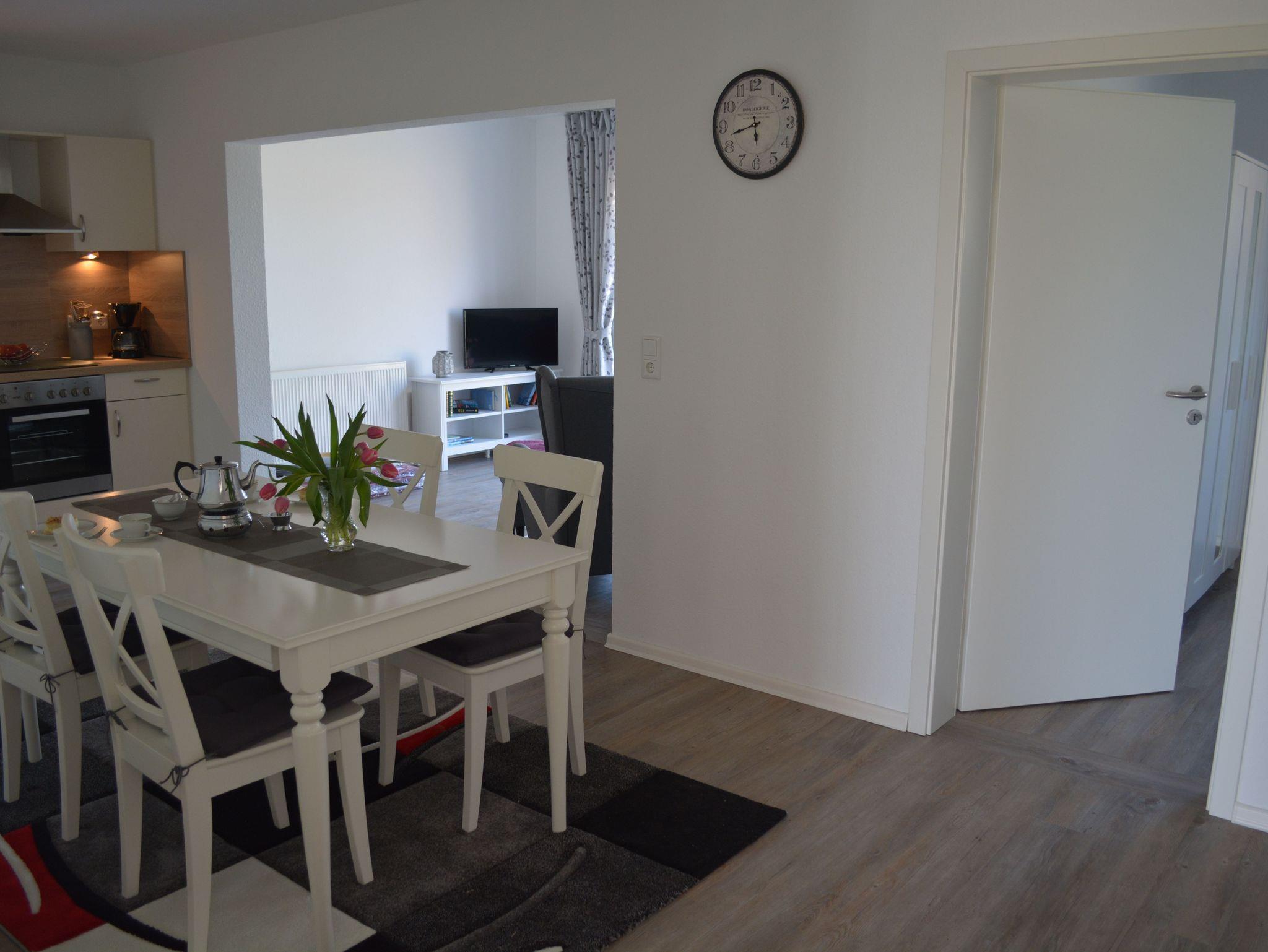 Die ebenerdige sowie modern und hell eingerichtete Ferienwohnung (ca. 68 qm) bietet Platz für bis zu 4 Personen. Sie verfügt über zwei separate Schlafzimmer (ein Schlafzimmer mit Doppelbett 1,80 m x 2,00 m und einem Schlafzimmer mit zwei Einzelbetten jeweils 0,90, x 2,00 m). Dem großzügigen Wohn- und Essbereich ist eine Küche mit E- Herd, Backofen, Geschirrspüler, Kühlschrank mit Gefrierfach, Toaster, Wasserkocher und Kaffeemaschine angegliedert. Das Bad mit ebenerdiger Dusche und WC verfügt zudem über eine Fußbodenerwärmung. SAT-TV, Stereoanlage und WLAN sind vorhanden. Kinderreisebett sowie ein Hochstuhl können zur Verfügung gestellt werden. Mit zur Ferienwohnung gehört eine separate Terrasse, welche mit Gartenmöbeln und Sonnenschirm ausgestattet ist. Der Internetzugang ist für unsere Gäste selbstverständlich kostenfrei. Wachmaschine und Wäschetrockner befinden sich ebenfalls in der Anlage und können gegen Gebühr genutzt werden. Handtücher und Bettwäsche werden einmalig gestellt (weitere Wechsel sind selbstverständlich gegen Gebühr möglich). Wir bitten im Interesse unserer allergischen Gäste um Verständnis, dass das Mitbringen von Haustieren nicht gestattet ist. Das Rauchen ist im Außenbereich möglich. Vermietung ausschließlich an Feriengäste, nicht an Firmen.