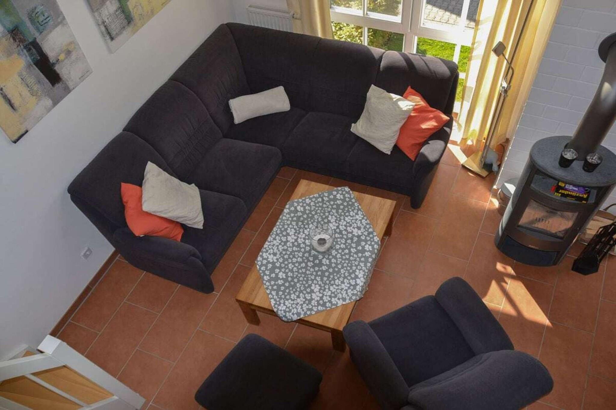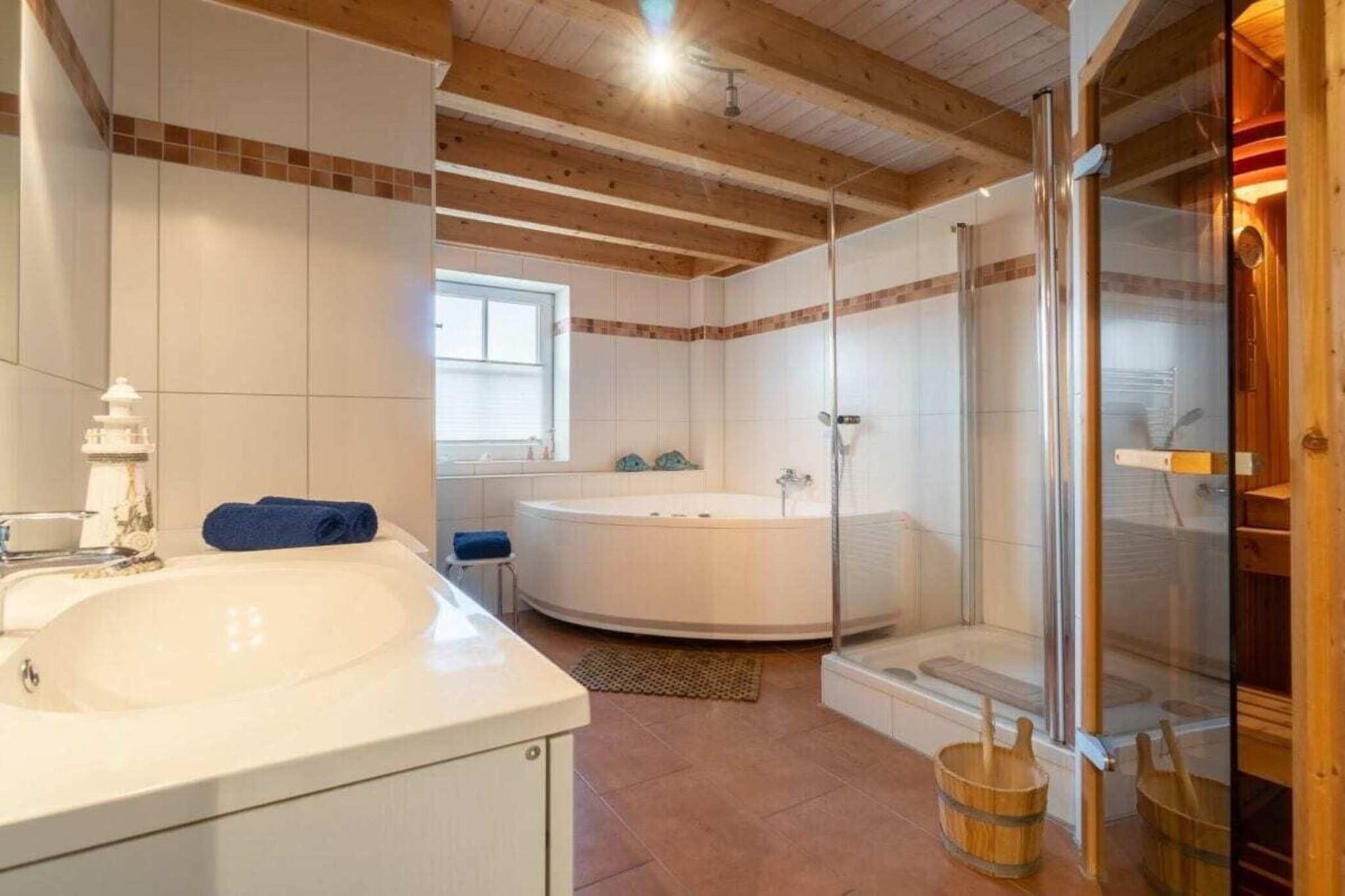 3 Schlafzimmer und 2 weitere Schlafmöglichkeiten (Schlafsofa) auf der Galerie, ein Fernseher mit integriertem Receiver, ein zweiter Fernseher steht in einem der Schlafzimmer, ein Wellnessbad mit Sauna und Whirlpool und ein zweites Duschbad im oberen Wohnungsbereich sorgen für Entspannung. Der gemütliche Wohnraum mit Kaminofen, eine voll ausgestattete Küche lassen keine Wünsche offen. Ein WC-Sitz und Steckdosensicherungen für die Kleinsten sind ebenso vorhanden wie eine Waschmaschine, ein Trockner, Bügelbrett und Bügeleisen. Ihre Fahrräder finden Platz im Fahrradschuppen und die Fliegengitter sorgen dafür, dass ungebetene Gäste draußen bleiben. Und wer zwischendurch im Internet surfen möchte, kann dies mit dem kostenfrei nutzbaren WLAN gerne tun.