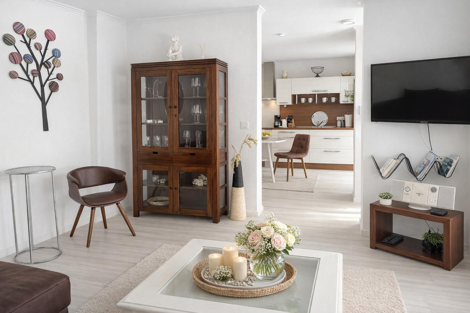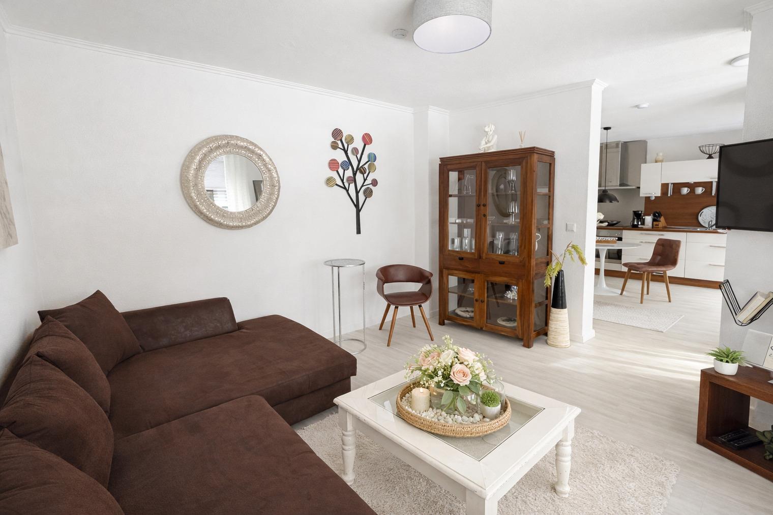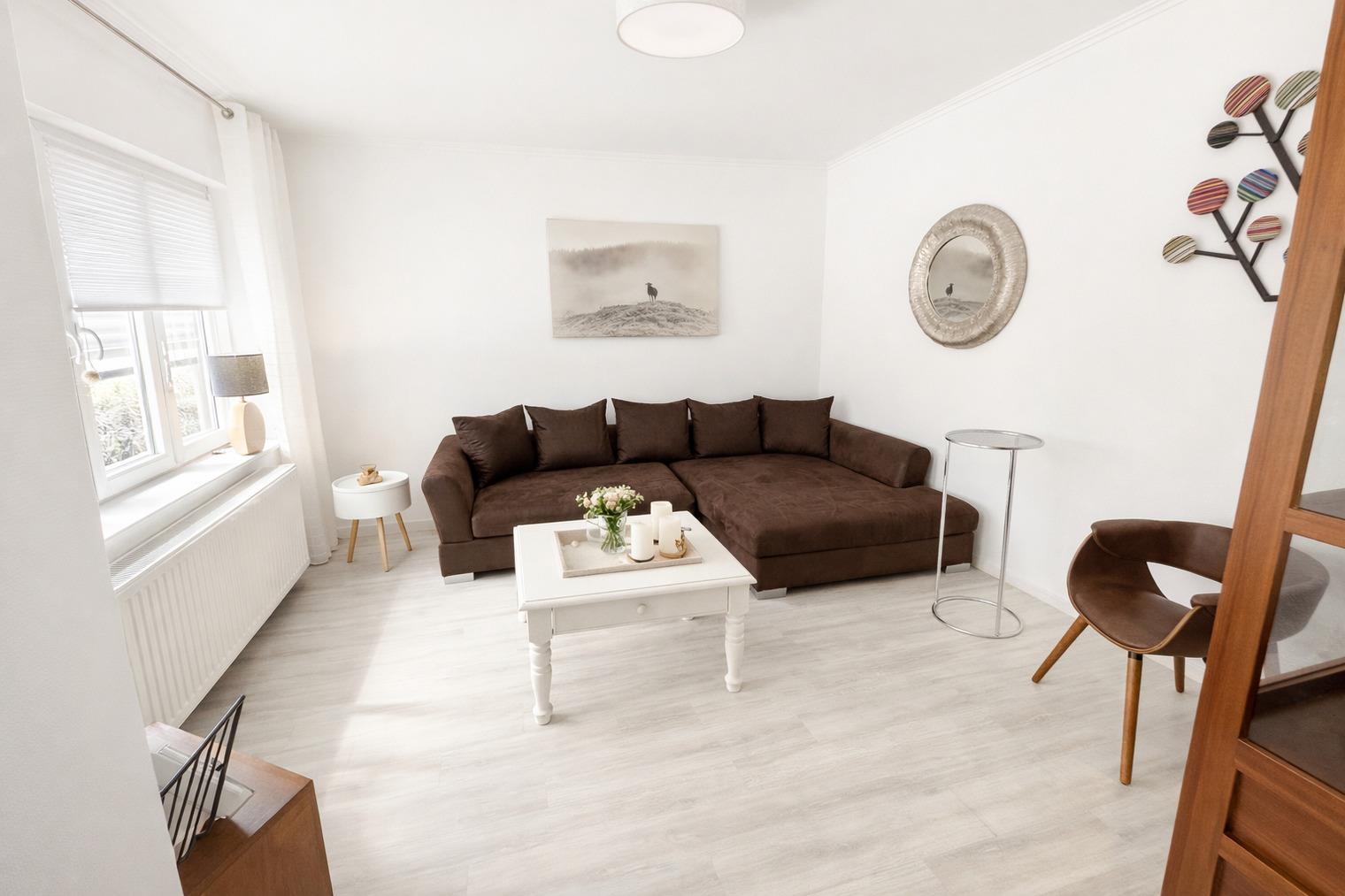 • Helles Wohnzimmer mit großer Eckcouch und Smart-TV