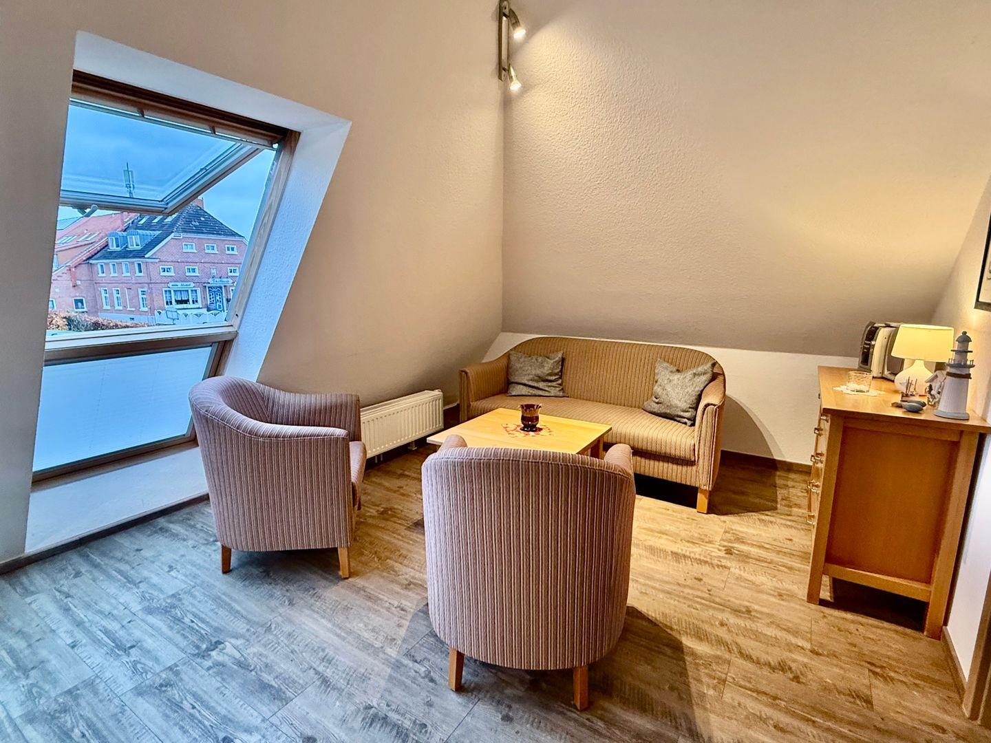 Ferienwohnung „Campen“ im Amtmannshaus direkt am Greetsieler Hafen, für bis zu 5 Personen im 1. Obergeschoss zur Gartenseite. Helles Wohnzimmer mit Essecke und Küchenzeile, Schlafzimmer mit Doppelbett, Dachgeschoss mit Doppelbett-Alkoven und Einzelbett, modernes Bad mit Dusche/WC. Smart-TV, kostenfreies W-LAN, voll ausgestattete Küche. Parkplatz & Fahrrad-Remise vorhanden. Betten und Handtücher bei Ankunft bereit.