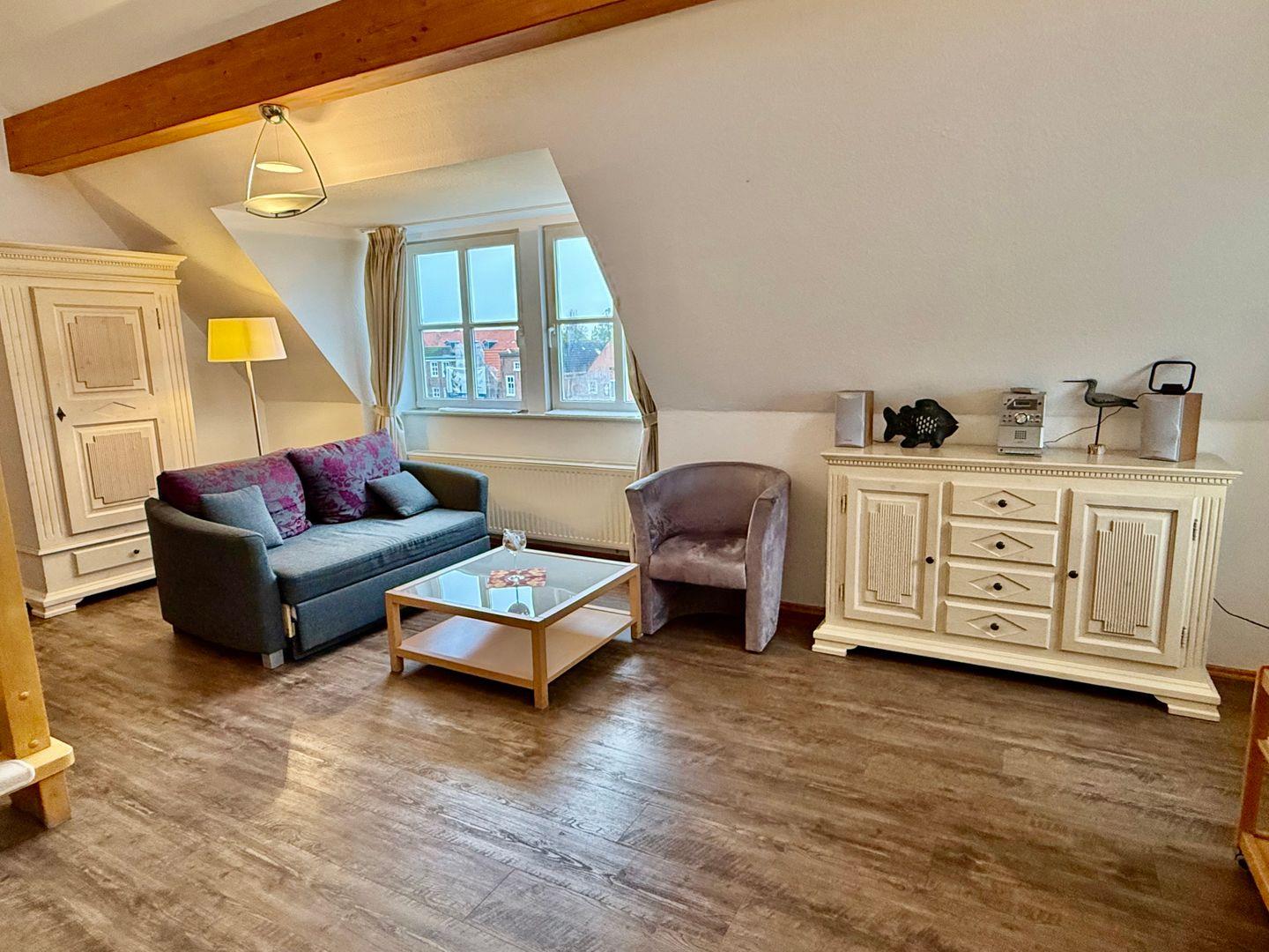 Die Nichtraucher-Ferienwohnung „Rysum“ liegt im Vorderhaus im Dachgeschoss und bietet Platz für 2 Personen. Genießen Sie den wunderschönen Blick auf den Kutterhafen und die historische Häusergalerie.
