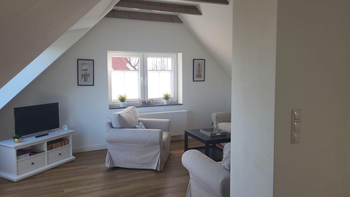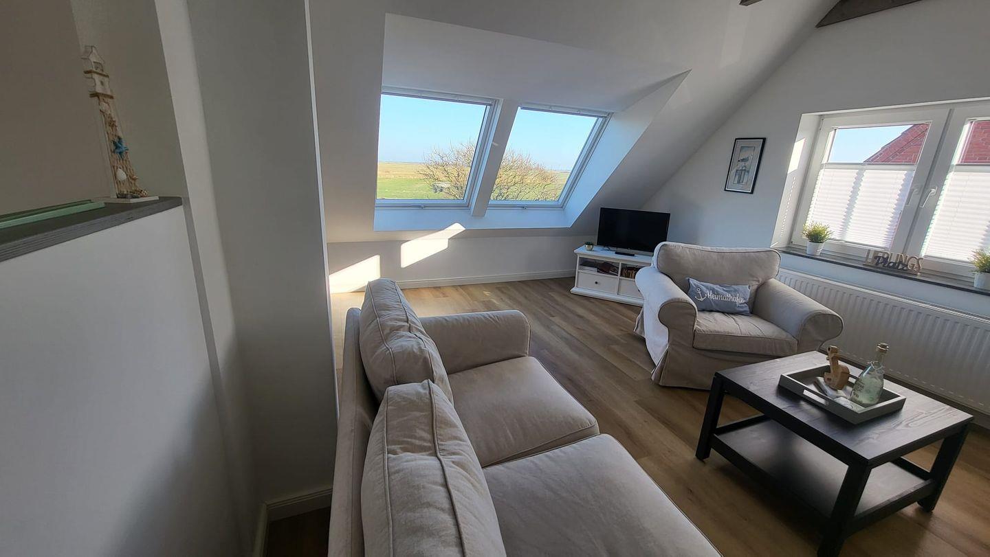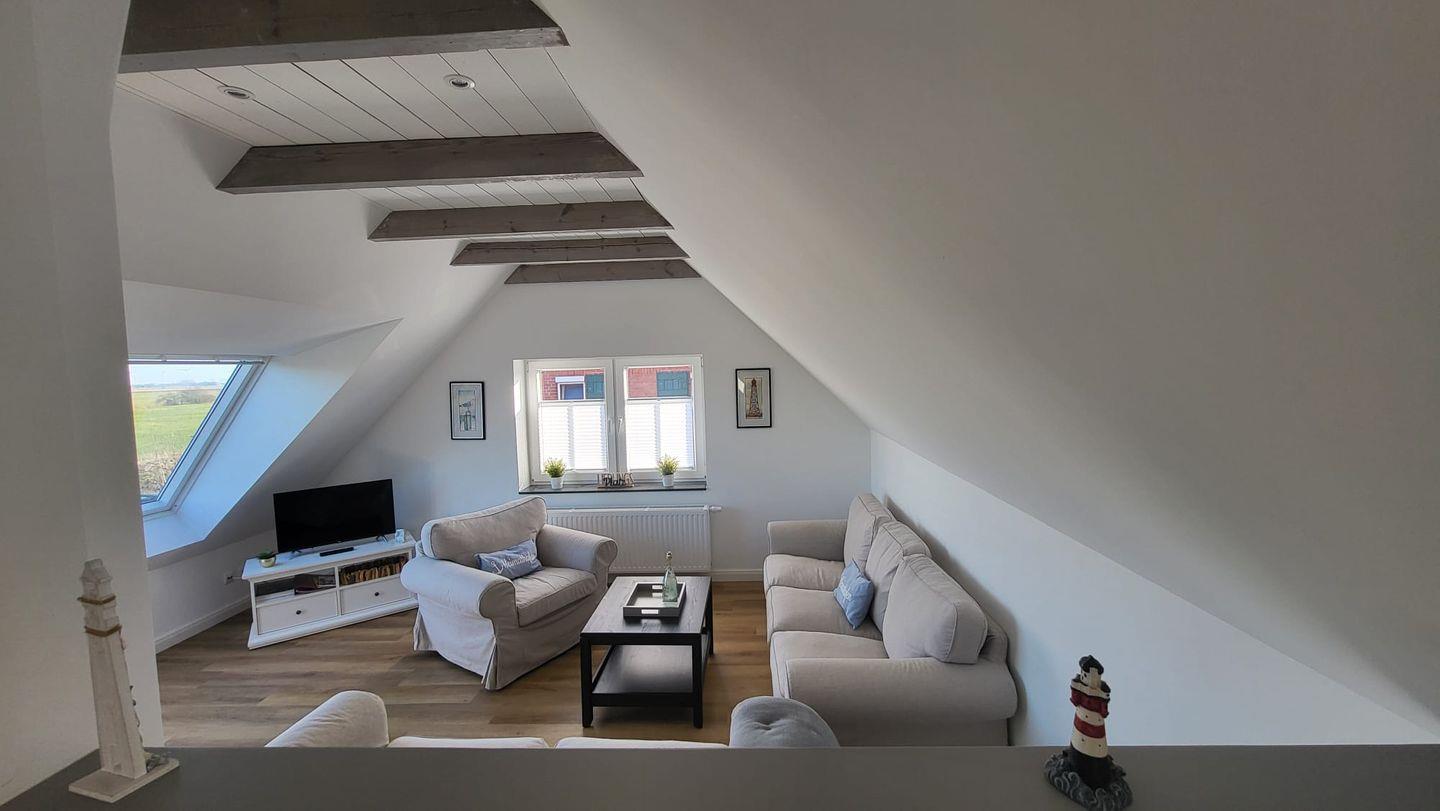 In der oberen Etage erwartet Sie ein großzügiger, lichtdurchfluteter Wohn- und Essbereich mit offener Küche. Mehrere Dachfenster eröffnen einen traumhaften Blick über die weite ostfriesische Landschaft. Auf der bequemen Couch können Sie bei einer Tasse Ostfriesentee entspannen und den Ausblick genießen oder sich vom modernen Flat-Screen unterhalten lassen.