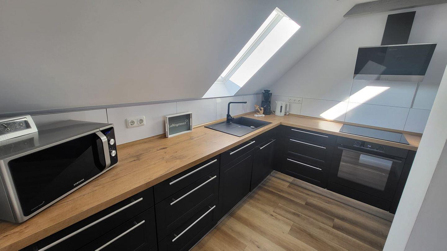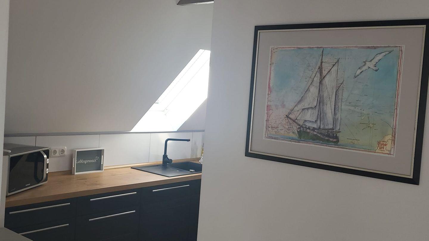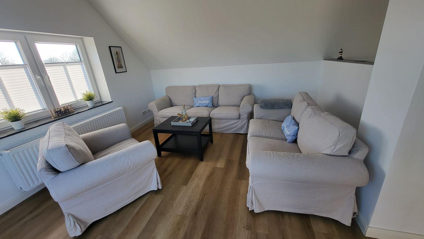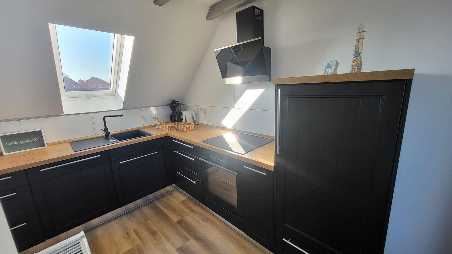 In der oberen Etage erwartet Sie ein großzügiger, lichtdurchfluteter Wohn- und Essbereich mit offener Küche. Mehrere Dachfenster eröffnen einen traumhaften Blick über die weite ostfriesische Landschaft. Auf der bequemen Couch können Sie bei einer Tasse Ostfriesentee entspannen und den Ausblick genießen oder sich vom modernen Flat-Screen unterhalten lassen.