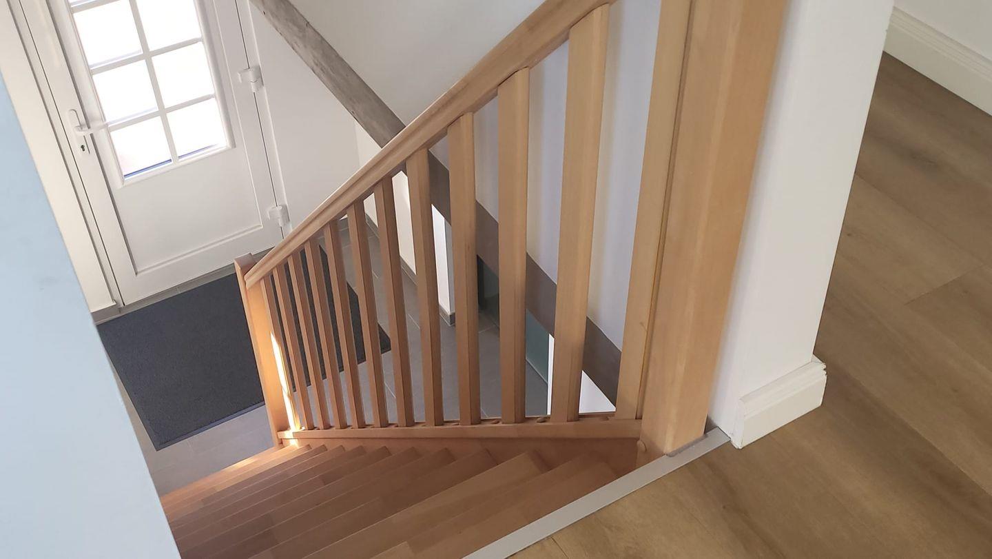 Direkt nebenan befindet sich das moderne, helle Badezimmer mit Fenster, Doppelwaschbecken und großer ebenerdiger Dusche. Ein separates WC sowie ein praktischer Abstellraum ergänzen den unteren Wohnbereich.