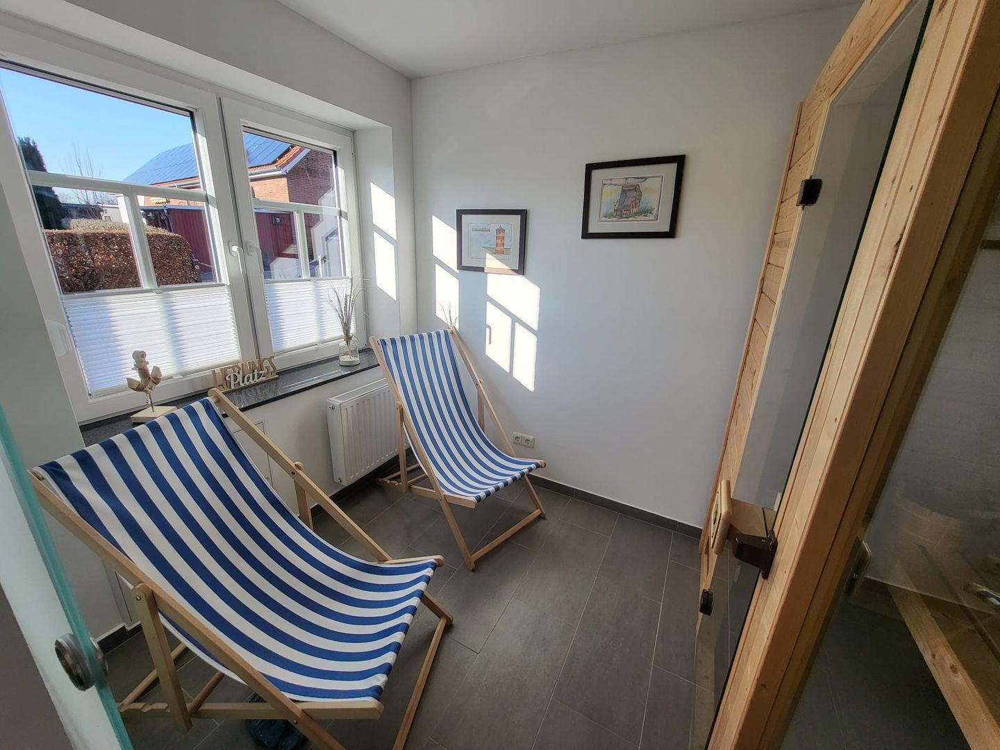 Die hauseigene Sauna ist das erste besondere Highlight im Erdgeschoss – ideal für entspannte Stunden nach einem Tag an der frischen Nordseeluft.