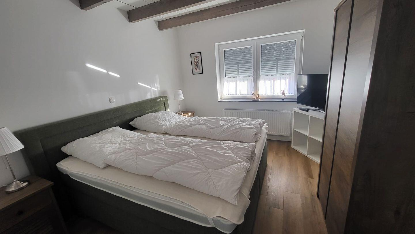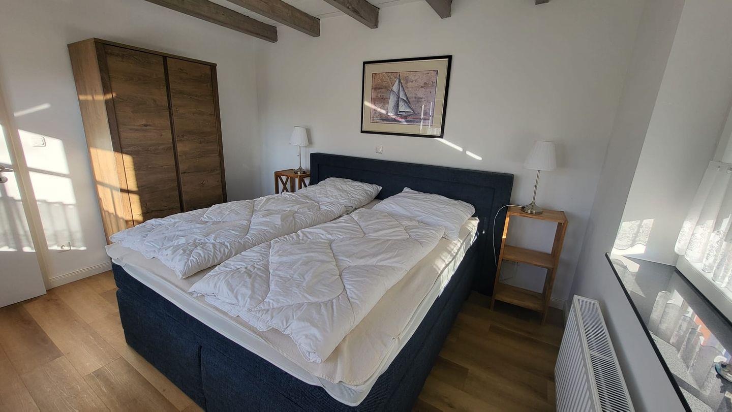 Das Erdgeschoss empfängt Sie mit zwei gemütlichen Schlafzimmern, jeweils ausgestattet mit hochwertigen Boxspring-Doppelbetten (bitte großes Spannbettlaken 180 x 200 cm mitbringen). Außenrollos sorgen für angenehme Verdunkelung und ruhige Nächte.
