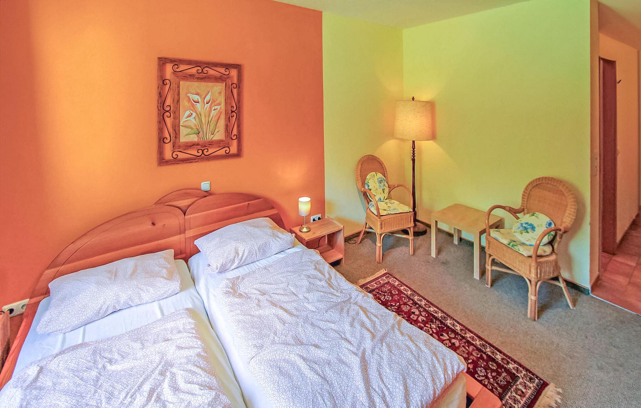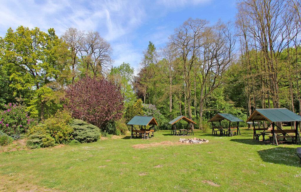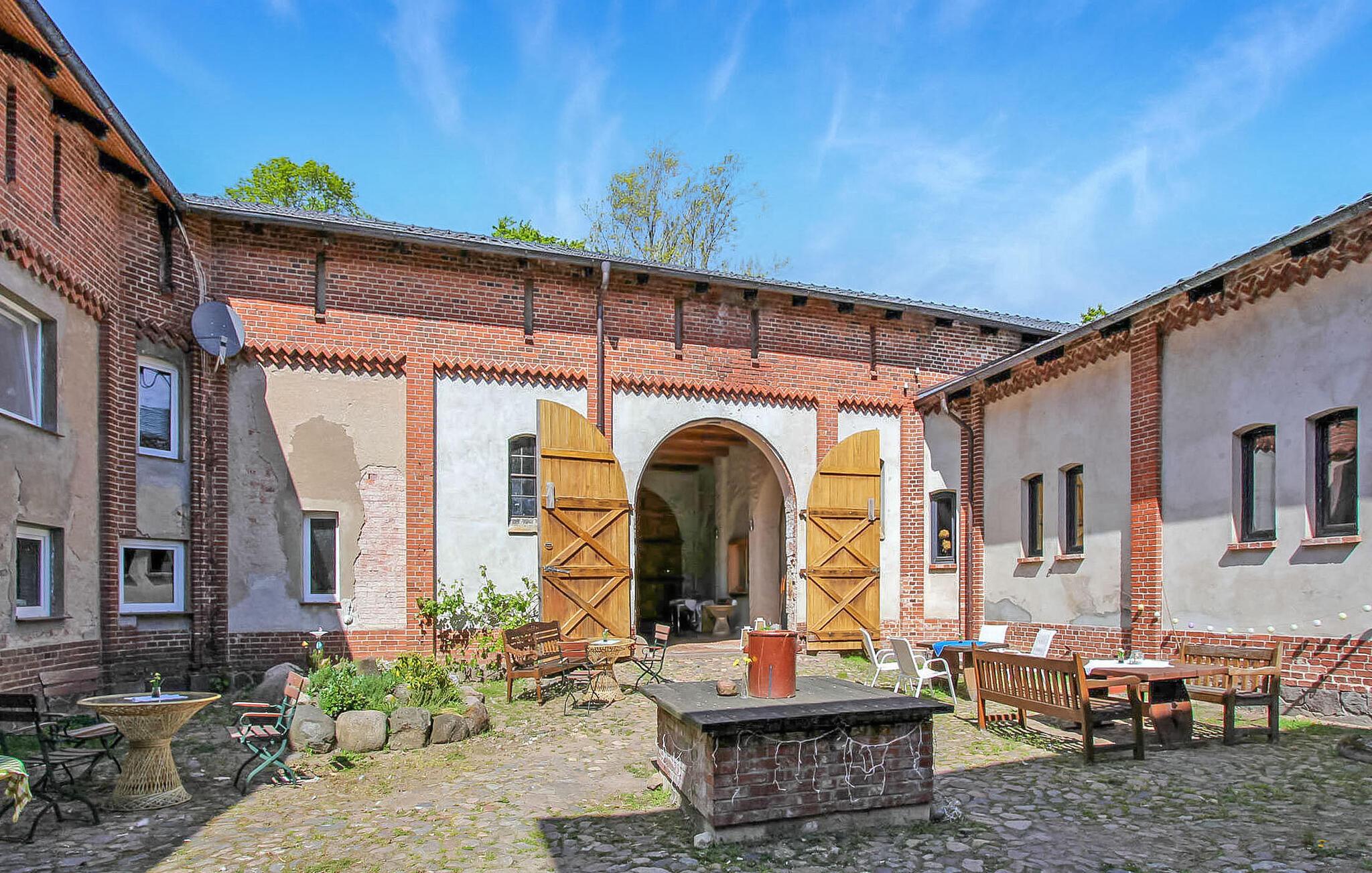Den store ferielejlighed med plads til op til 12 personer strækker sig over en hel etage i den tidligere stalde (vogn- og ridestald), der blev ombygget til gæstehus og ligger roligt, ugeneret. og i direkte skovbeliggenhed på en 7.000 kvm stor ejendom.Boligen er særdeles velegnet til grupper. Den består af et stort køkken-alrum (spisebord, tekøkken med el-komfur, ovn og opvaskemaskine, TV, radio) og flere separate dobbeltværelser (dobbeltseng, TV, bad/toilet, centralvarme), som leder ud fra en offentlig gang med forskellige siddepladser. (Antal dobbeltværelser afhænger af antal personer). Ingen forplejning!To yderligere separate ferielejligheder til 2 og 4 personer ligger på øverste etage (ejendomsnummer DZV261 og DZV262). På det store parklignende udeareal er der sidde- og grillplads, parkeringsplads og cykelkælder. Der er yderligere siddemuligheder i den historiske bygnings indre gårdhave. Ejeren opdrætter adskillige eksotiske fugle, smådyr og alpacafår separat på en naboejendom. Den lille fuglepark kan besøges efter ønske. Den samlede pris inkluderer slutrengøring samt vand- og energiforbrug. Du kan medbringe eget sengetøj eller leje det. Du skal selv medbringe håndklæder. Kæledyr: Et kæledyr er tilladt i denne ejendom. Alle andre dyr kræver ejerens samtykke inden booking. Kuchelmiß er en landsby i et skov- og søområde i udkanten af naturreservatet "Nebeltal". Det klimatiske kursted Krakow am See med en veludviklet turistinfrastruktur ligger cirka 10 km væk. Butikker og bade/fiskesø i byen. På grund af den bekvemme beliggenhed på A 19 (2 km), kan hansestaden Rostock og Østersøen nås på cirka 45 minutter. Godset Kuchelmiß var ejet af adelige i mange århundreder. Det store slot fra før eksisterer ikke længere i dag. Vandmøllen, herregården, staldene og en park minder blandt andet om den historiske fortid.
