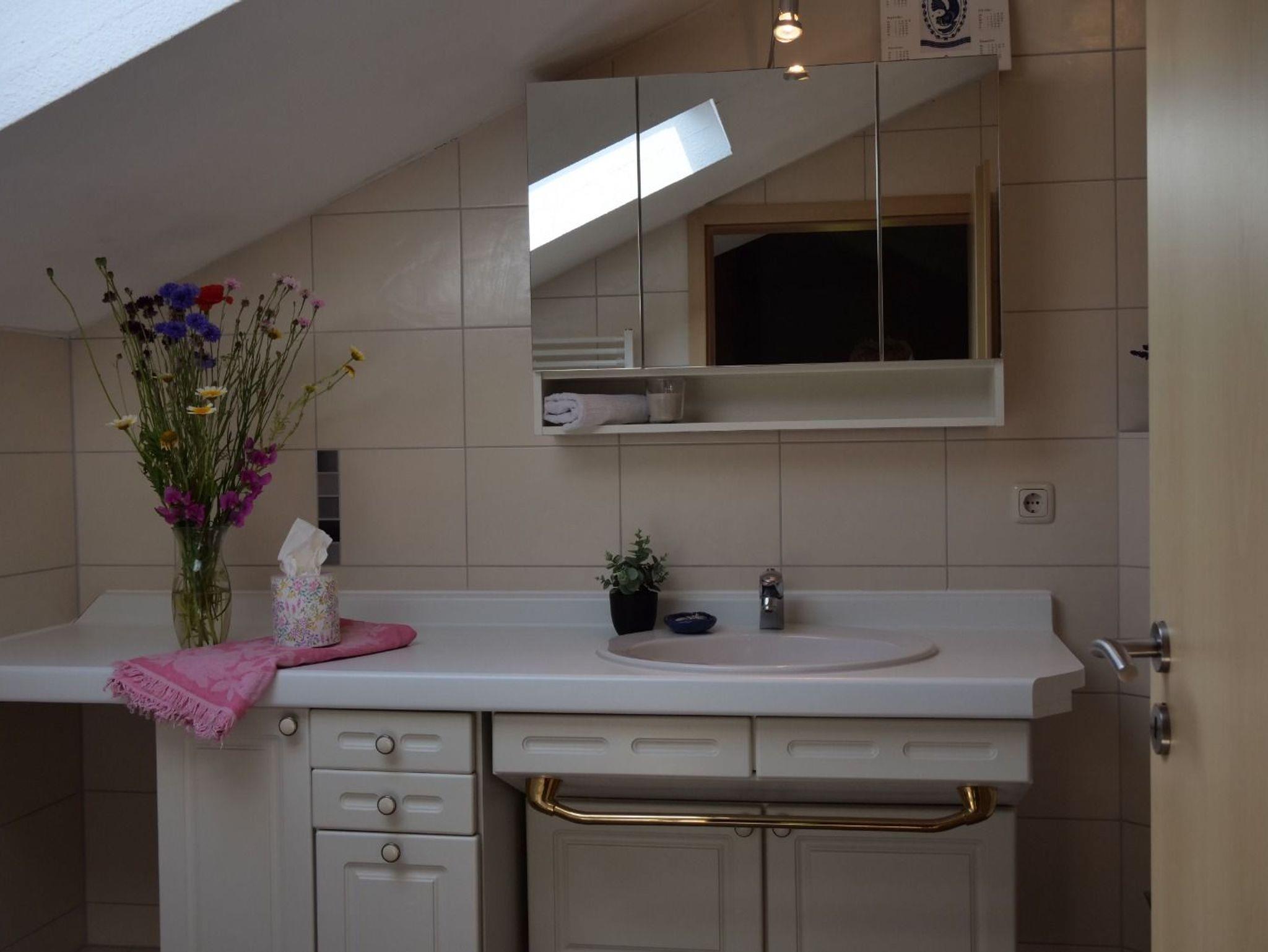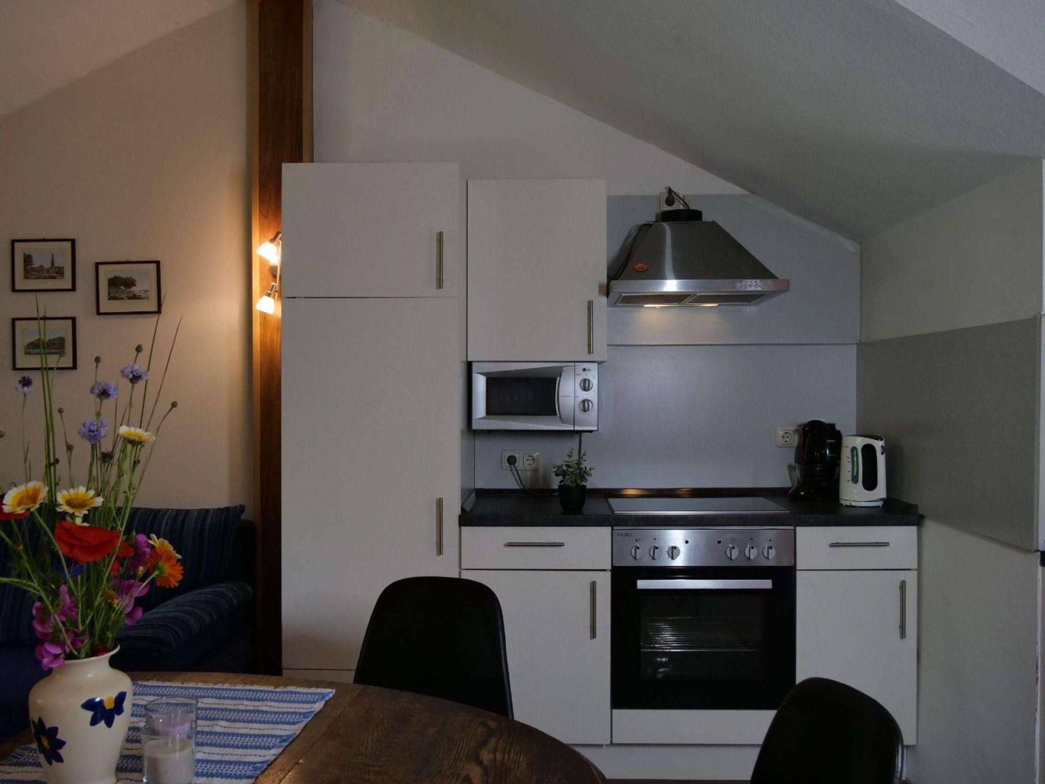Die Ferienwohnung im 1. OG ist perfekt ausgestattet für Ihren Selbstversorger-Urlaub. Eine offene Wohnküche mit Kühl-/Gefrierkombination, Kaffeemaschine, Herd, Backofen und Mikrowelle lädt zum gemeinsamen Kochen und Verweilen ein. Im Wohnbereich sorgt ein Fernseher für Unterhaltung, ein Sofa mit Schlaffunktion bietet Aufbettungsmöglichkeiten. Das Schlafzimmer ist mit einem komfortablen Doppelbett und einem Kleiderschrank ausgestattet, während das Duschbad mit WC keine Wünsche offen lässt.