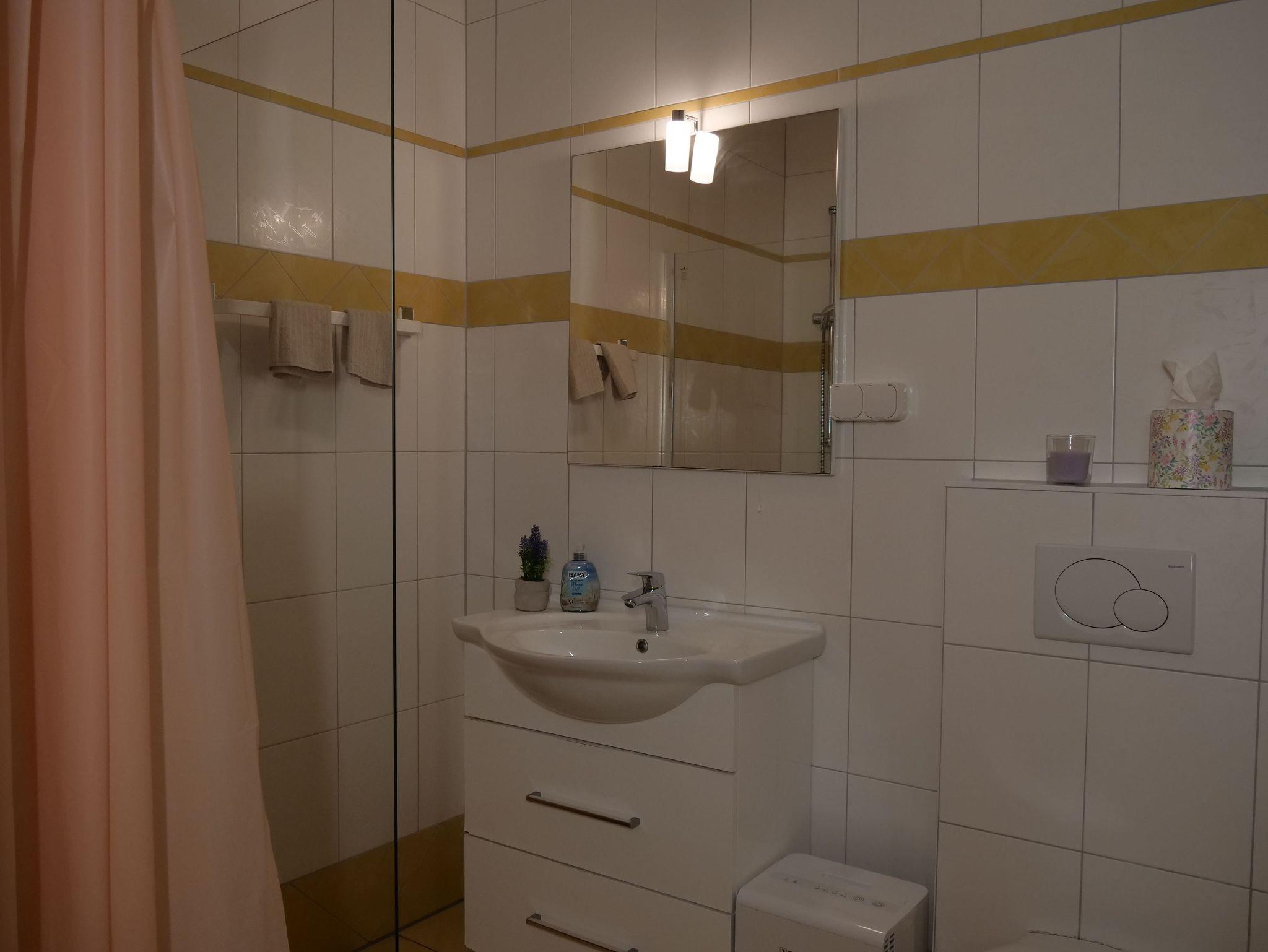 Die Ferienwohnung im 1. OG ist perfekt ausgestattet für Ihren Selbstversorger-Urlaub. Eine offene Wohnküche mit Kühl-/Gefrierkombination, Kaffeemaschine, Herd, Backofen und Mikrowelle lädt zum gemeinsamen Kochen und Verweilen ein. Im Wohnbereich sorgt ein Fernseher für Unterhaltung, ein Sofa mit Schlaffunktion bietet Aufbettungsmöglichkeiten. Das Schlafzimmer ist mit einem komfortablen Doppelbett und einem Kleiderschrank ausgestattet, während das Duschbad mit WC keine Wünsche offen lässt.