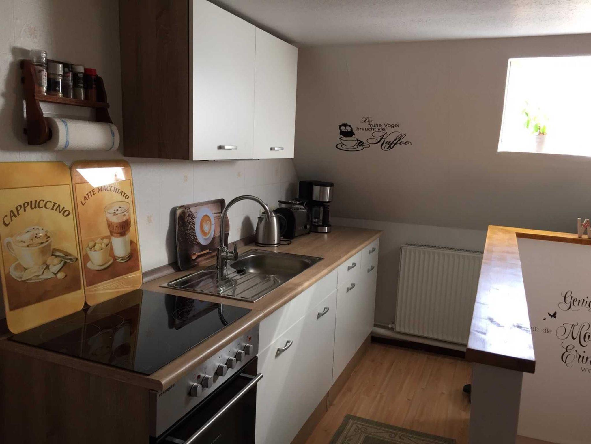 * Kleine Küche mit Kühlschrank, Kochgelegenheit, Kaffeemaschine, Toaster, Esstisch mit 2 Stühlen