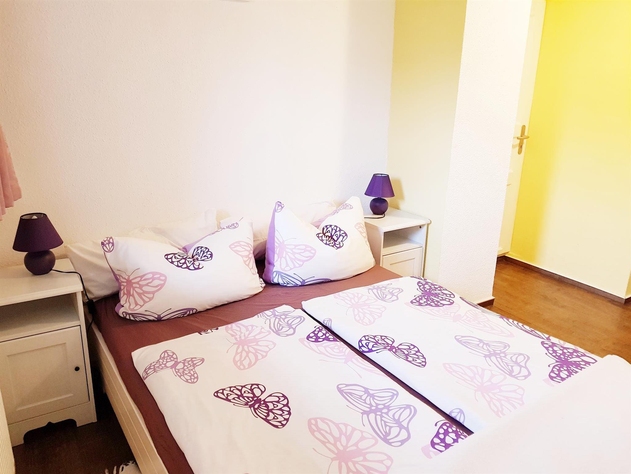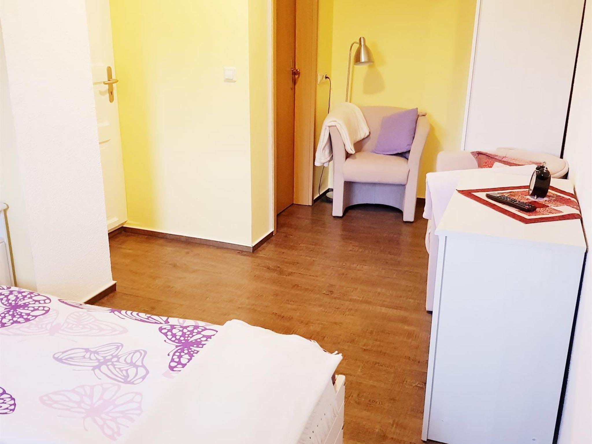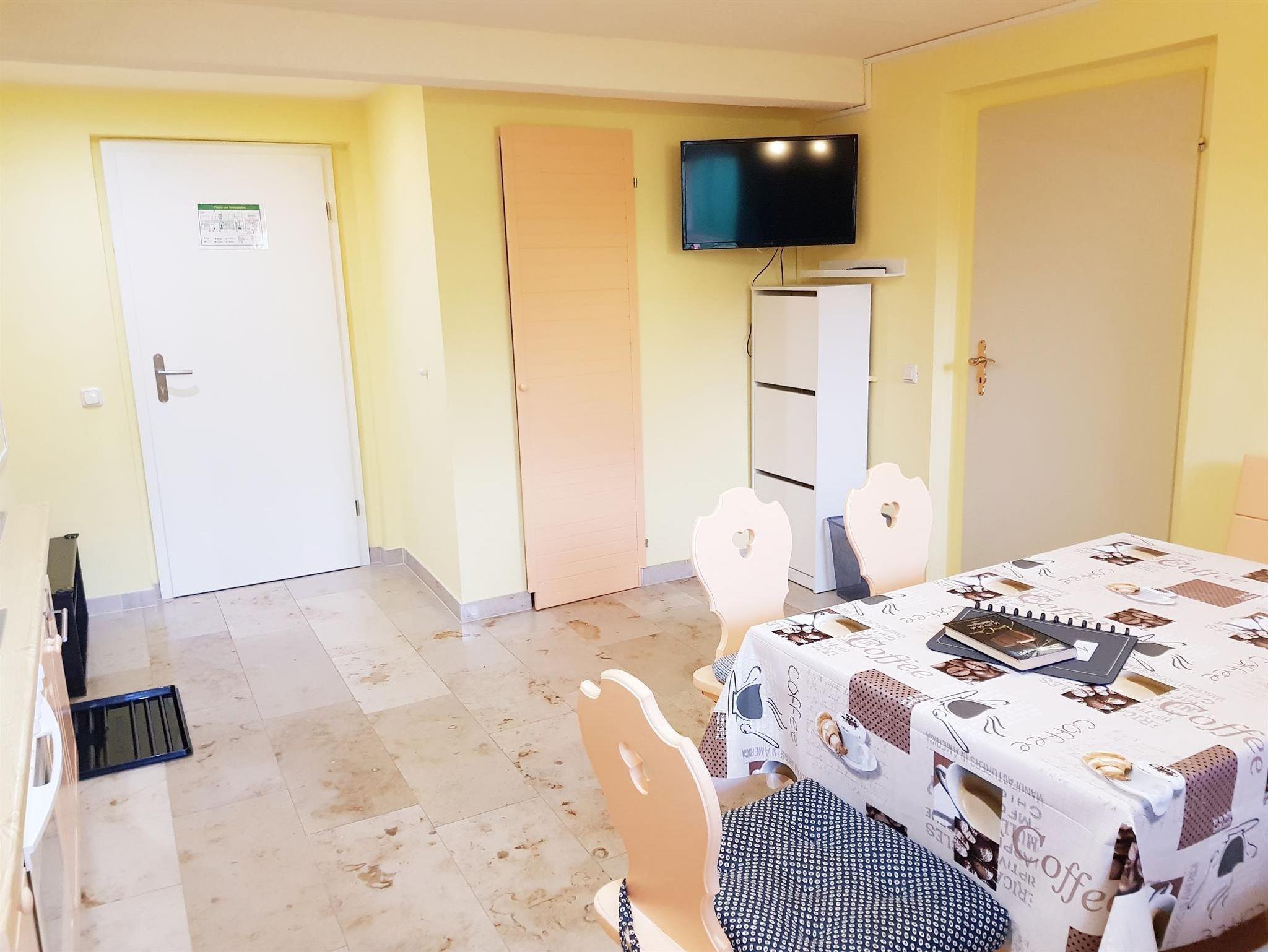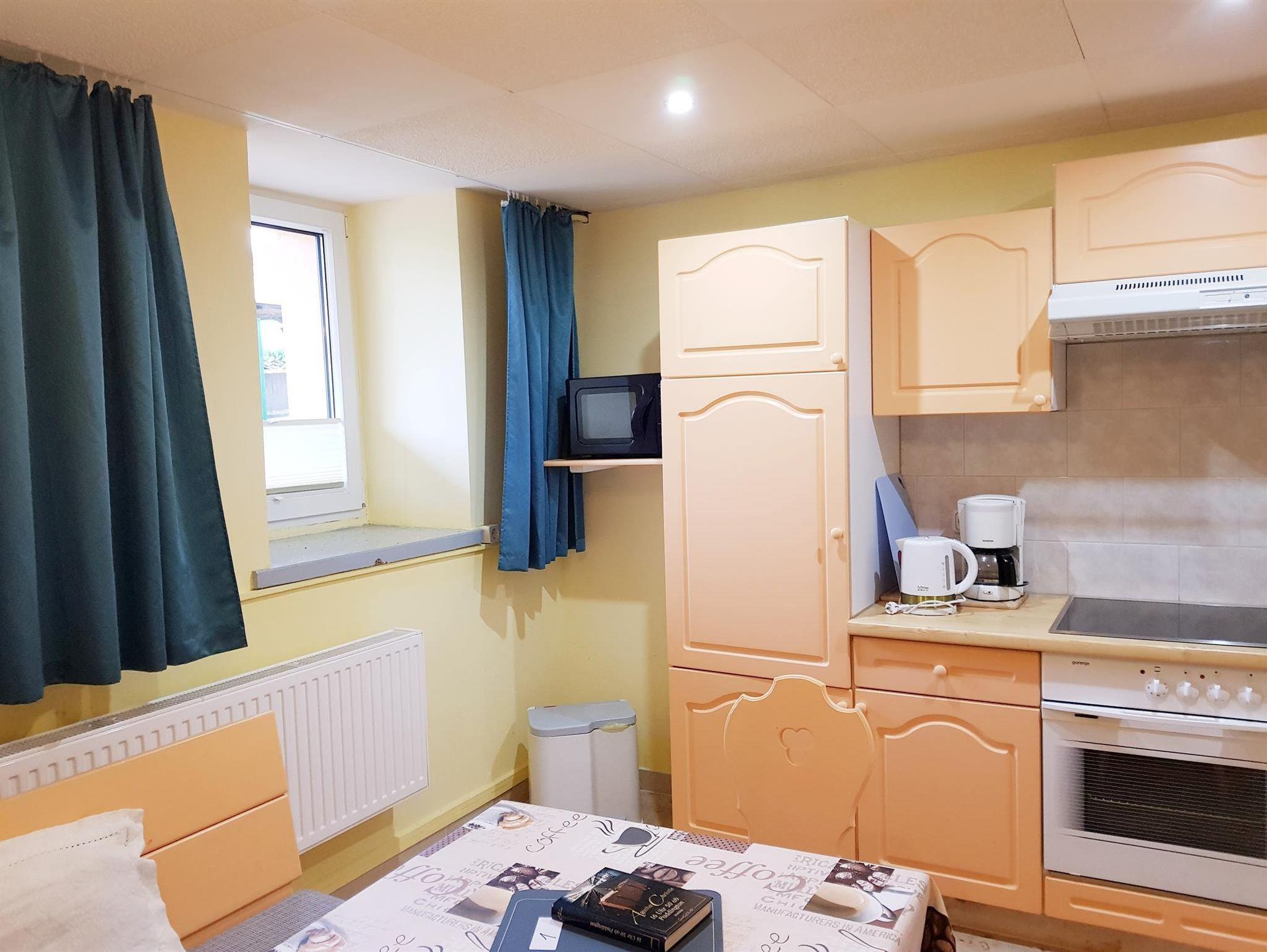 Die große Ferienwohnung (41 qm; Erdgeschoss, straßenseitig mit Bahnblick) verfügt über eine Wohnküche mit Kochzeile (Backröhre, vier Herdfelder, Kühlschrank - ohne Gefrierfach, Spüle) mit Toaster, Kaffeemaschine, Wasserkocher, Geschirr, Kochgeschirr und Besteck. Davon gehen zwei hintereinander liegende Schlafräume (Bettbreite Raum 1: 1,60 m; Bettbreite Raum 2: 1,40 m) ab, welche beide Zugang zum gemeinsamen Bad (mit DU/WC, Handtücher, Fön, Kosmetiktücher, Handseife und Schminkspiegel) haben. Alle drei Räume besitzen einen Flachbild-TV.
