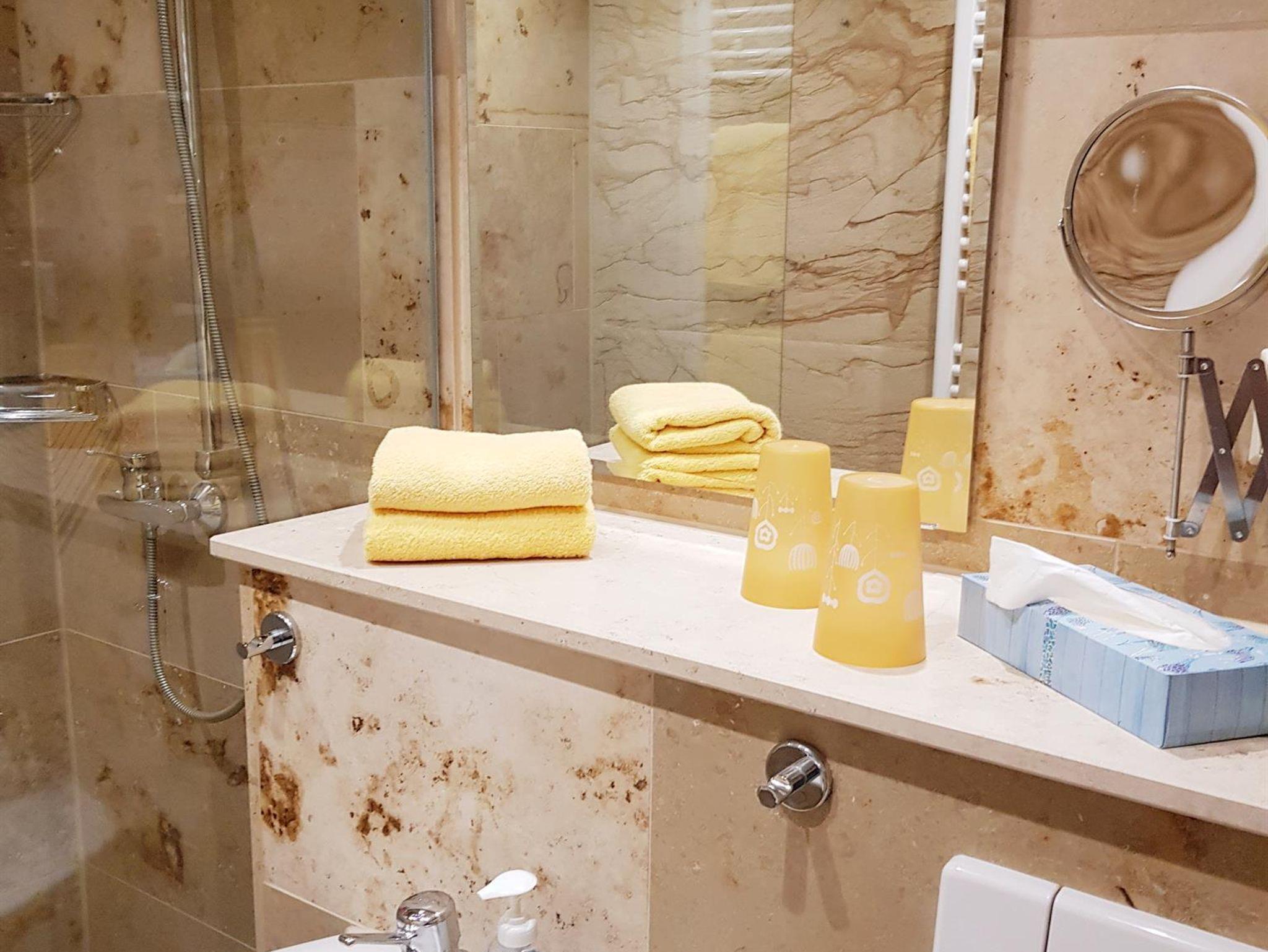 Das Familienzimmer (39 qm; erste Etage; hofseitig - ohne Bahnblick!) besteht aus zwei Räumen mit jeweils eigenen Bädern und zwei Zugängen zum Balkon. Durch eine abschließbare Verbindungstür wird das kleinere, 14 qm große Zimmer mit dem 1,40 m breiten, bezogenen Bett vom größeren Zimmer abgetrennt. Hier gibt es auch eine kleinen Kühlschrank. Im größeren der beiden Zimmer (Bettbreite: 1,80 m; Betten bezogen) befindet sich die Kochnische mit zwei Herdplatten, Kühlschrank mit Gefrierfach, Kaffeemaschine, Wasserkocher, Toaster, Geschirr, Kochgeschirr und Besteck. Es gibt einen ausziehbaren Esstisch mit zwei Stühlen und eine Sitzbank. In beiden Zimmern befinden sich ein Flachbild-TV, ein kleiner Tisch und zwei Sessel. In den Bädern gibt es Dusche/WC, Handtücher, Fön, Kosmetiktücher, Schminkspiegel und flüssige Handseife. Im Bad des größeren Zimmers gibt es zusätzlich noch einen Handtuchheizkörper.