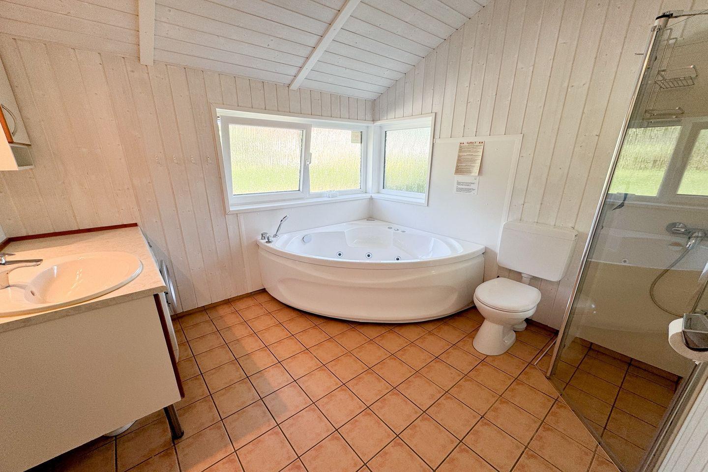 Das Badezimmer bietet eine Sauna, einen Whirlpool (für bis zu 2 Personen), eine bodengleiche Dusche, WC und ein Waschbecken.