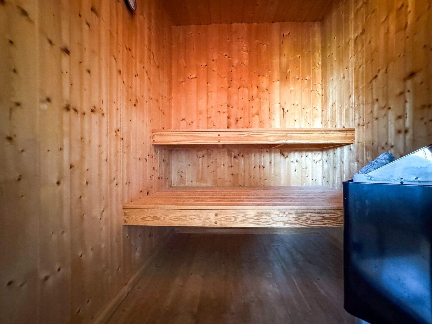 Das Badezimmer bietet eine Sauna, einen Whirlpool (für bis zu 2 Personen), eine bodengleiche Dusche, WC und ein Waschbecken.
