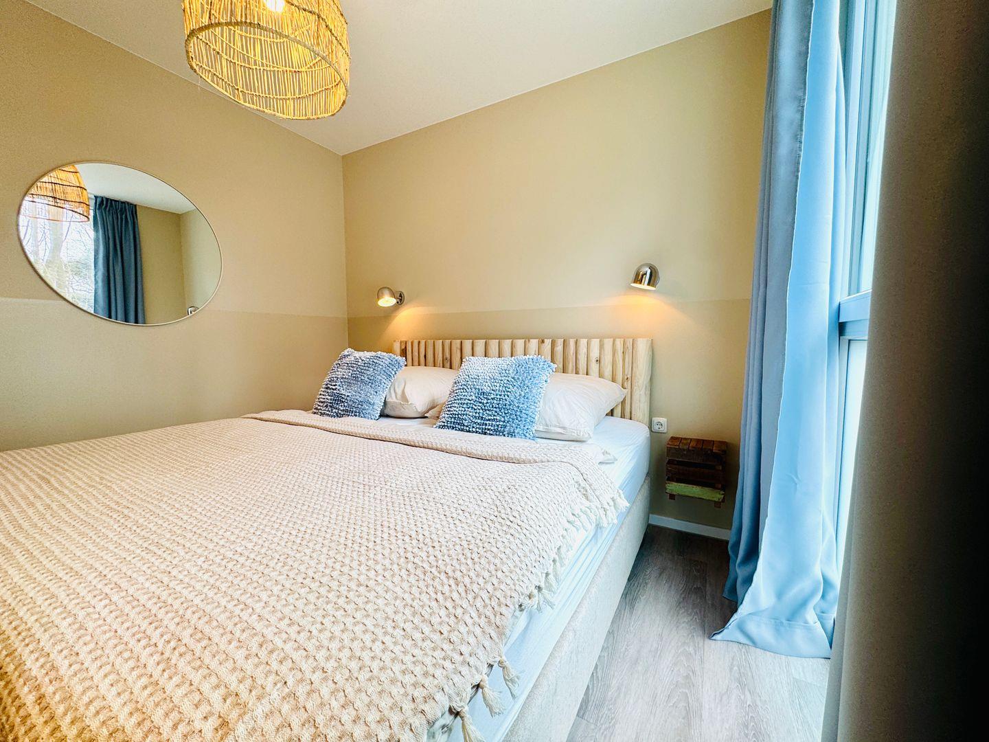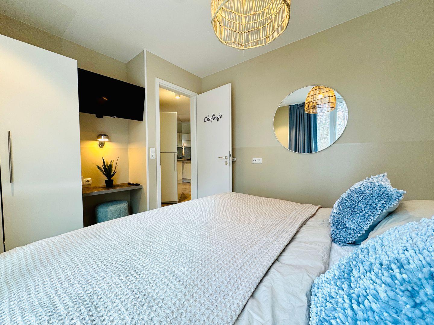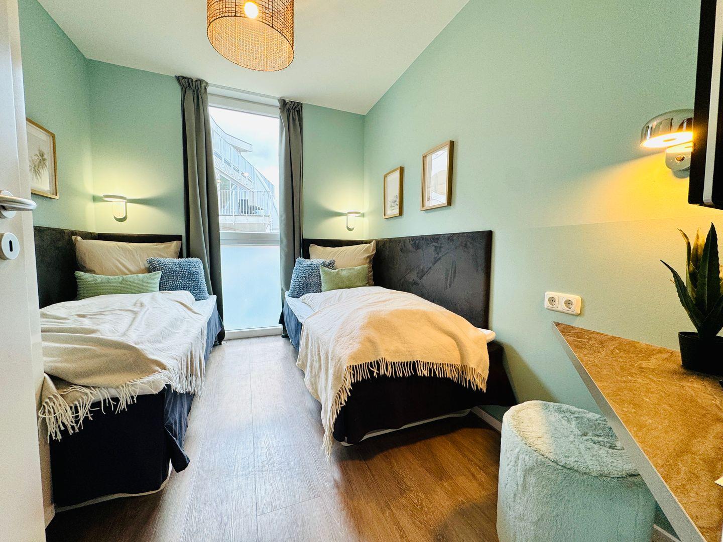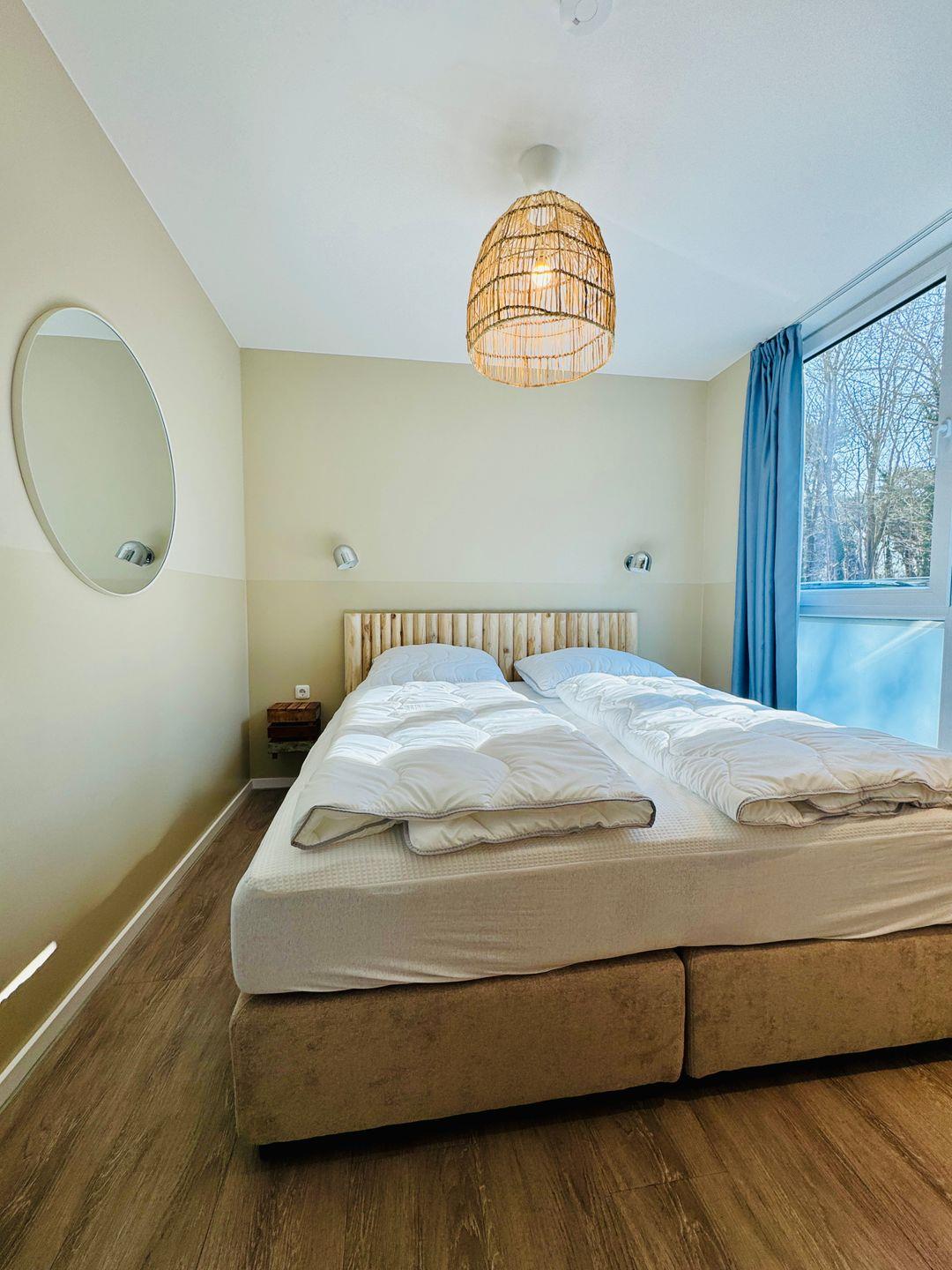 Die Ferienwohnung verbindet moderne Ausstattung mit einer stilvollen, zugleich wohnlichen Atmosphäre. Drei separate Schlafzimmer mit langlebigem Vinylboden sorgen für Privatsphäre und Flexibilität. Zwei Schlafzimmer sind mit Doppelbetten (180x200 cm) und getrennten Matratzen ausgestattet, das dritte Schlafzimmer verfügt über zwei Einzelbetten (90x200 cm). Im offen geschnittenen Wohn- und Essbereich gibt es eine hochwertige Sofaecke und einen offenen Kamin für gemütliche Stunden. Der Essbereich bietet einen großen Tisch, und ein kleiner Schreibtisch eignet sich, wenn du während des Aufenthalts arbeiten möchtest.