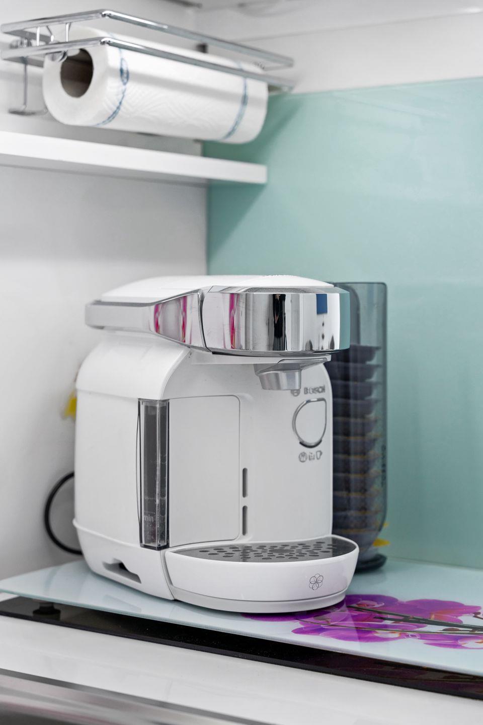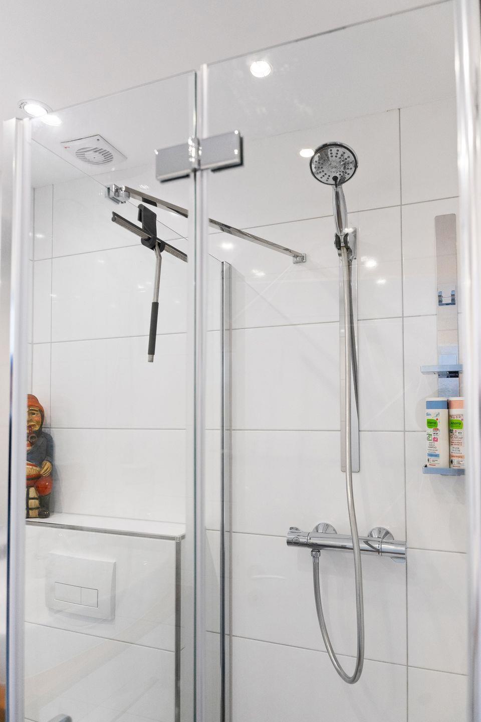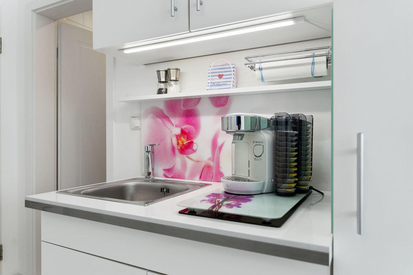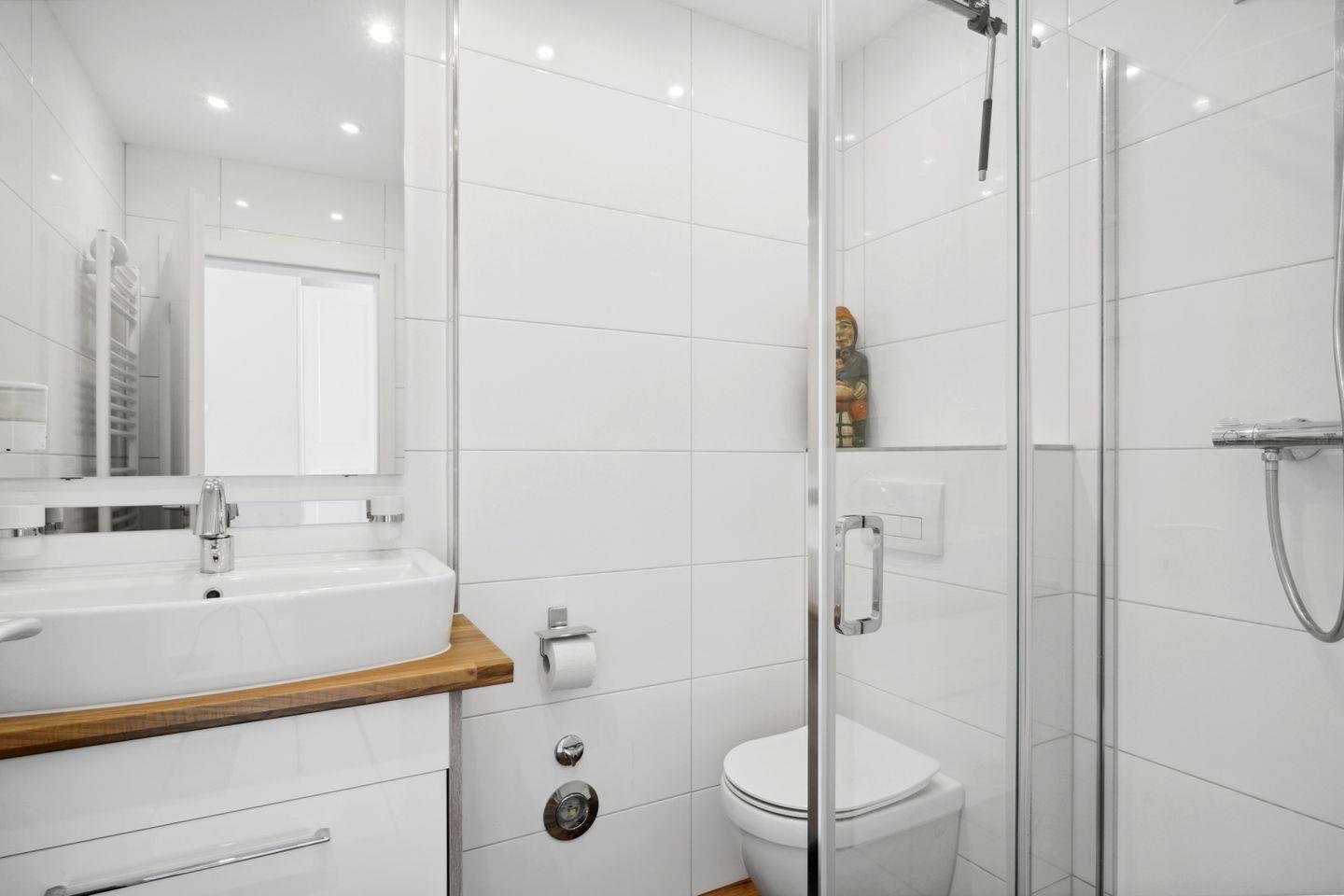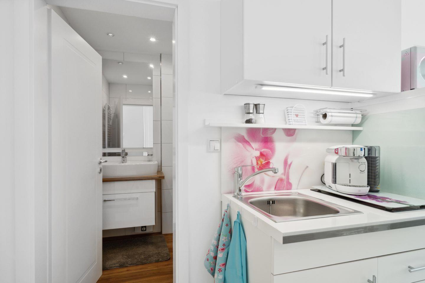 Die Wohnung verfügt über ein modernes Badezimmer mit bodengleicher Dusche, einem Waschbecken und einem WC, sodass Sie sich nach einem langen Tag am Strand erfrischen können. Der offene Küchen- und Essbereich ist mit hochwertigen Geräten ausgestattet, darunter ein Cerankochfeld, ein Elektrobackofen, eine Mikrowelle, sowie eine Espressomaschine der Marke Tassimo. Sie finden hier auch einen Kühlschrank mit integriertem Gefrierfach, einen Toaster und einen Wasserkocher. Für Ihre Selbstversorgung stehen ausreichend Geschirr, Besteck und Küchenutensilien zur Verfügung, die Ihnen das gemeinschaftliche Kochen erleichtern. Gegessen werden kann am praktisch ausziehbarem Esstisch.