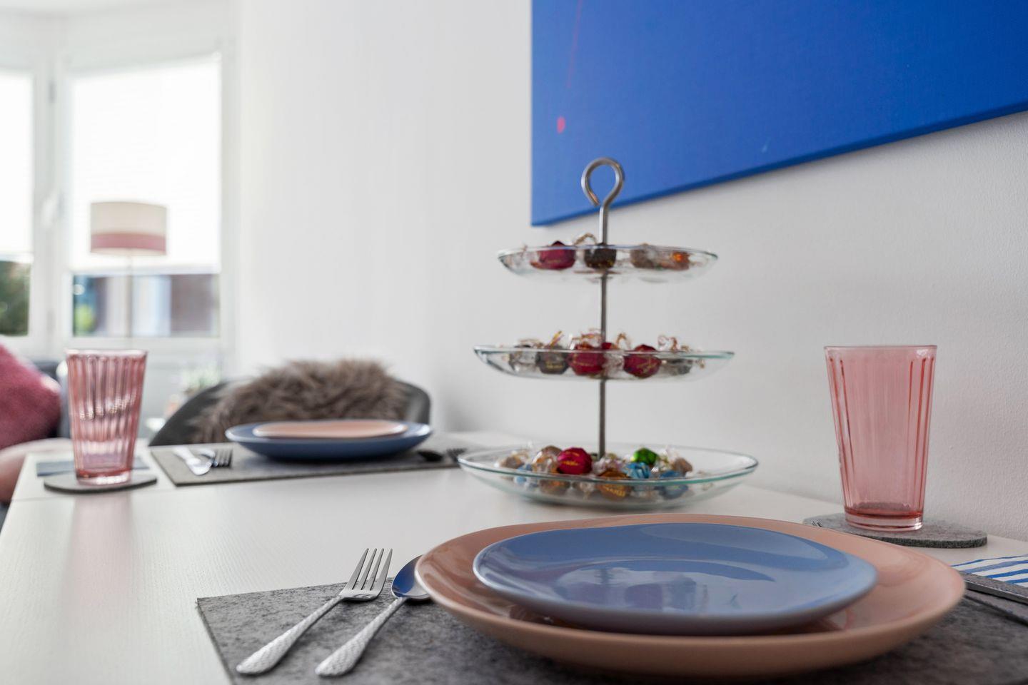 Das lichtdurchflutete Wohnzimmer lädt zum Entspannen ein und bietet nicht nur eine Sofaecke, sondern auch einen Esstisch für gesellige Abendessen. Der bereitgestellte Fernseher sorgt für Unterhaltung an gemütlichen Abenden. Zusätzlich ist ein kostenfreies WLAN vorhanden, sodass Sie während Ihres Aufenthaltes stets mit dem Internet verbunden sind.