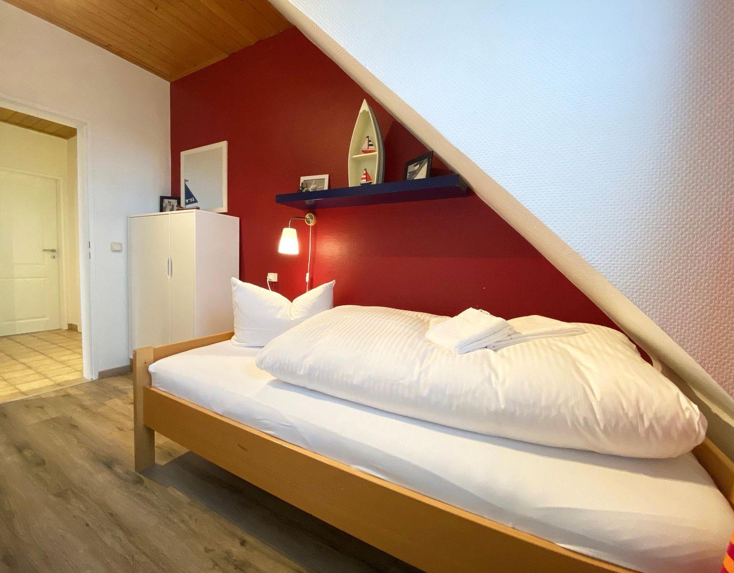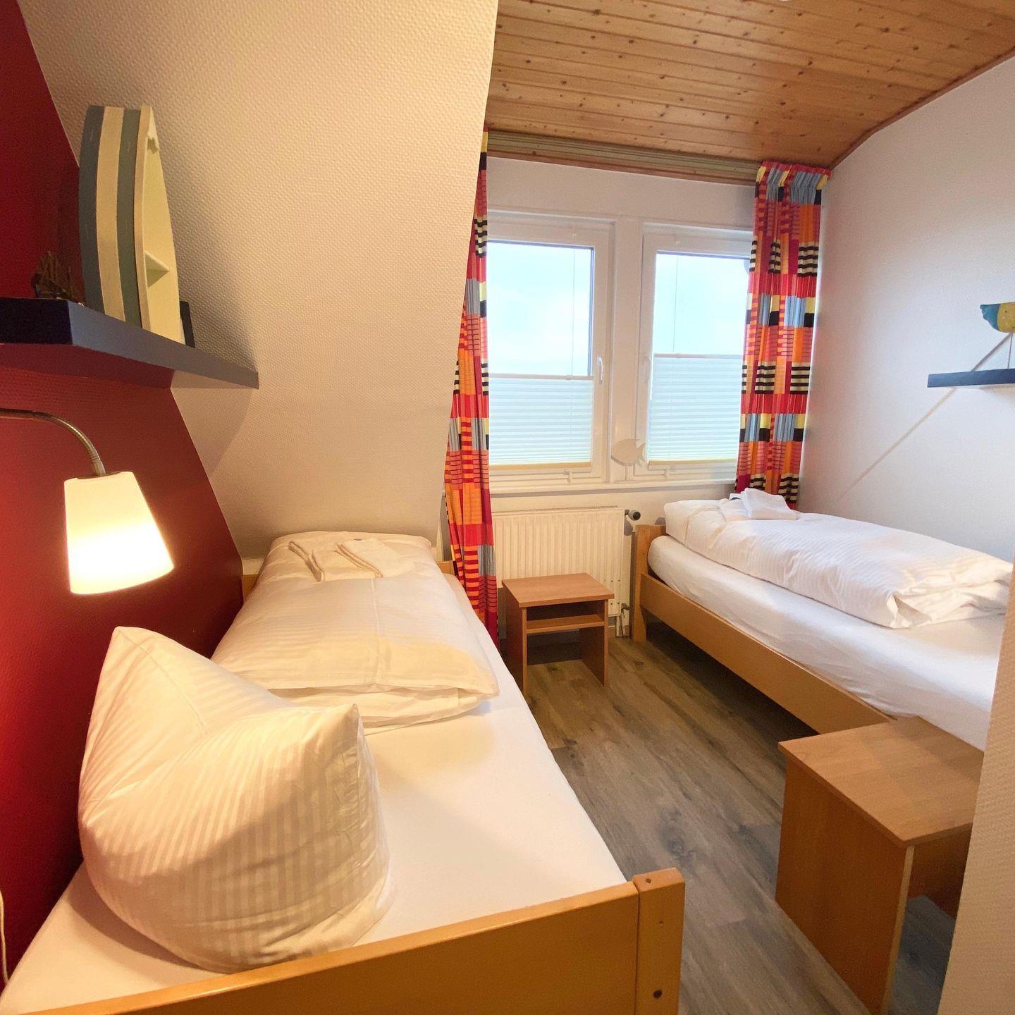 Die beiden getrennten Schlafzimmer sind ausgestattet mit einem Doppelbett und zwei Einzelbetten.