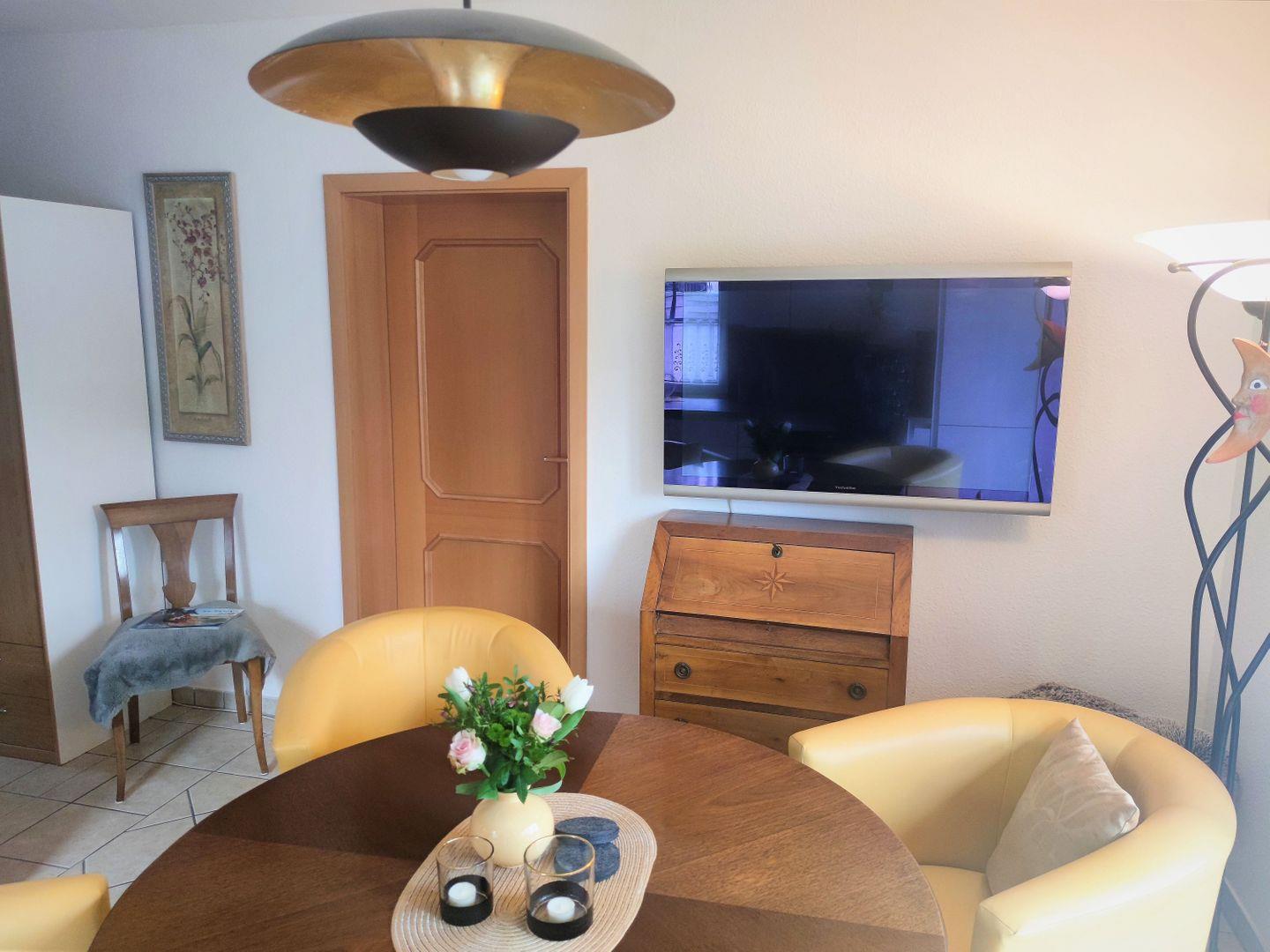 WOHNEN // Wohnraum mit Essbereich, Sitzgarnitur mit bequemer Couch, Flachbild-TV, Radio, DVD-Player ++