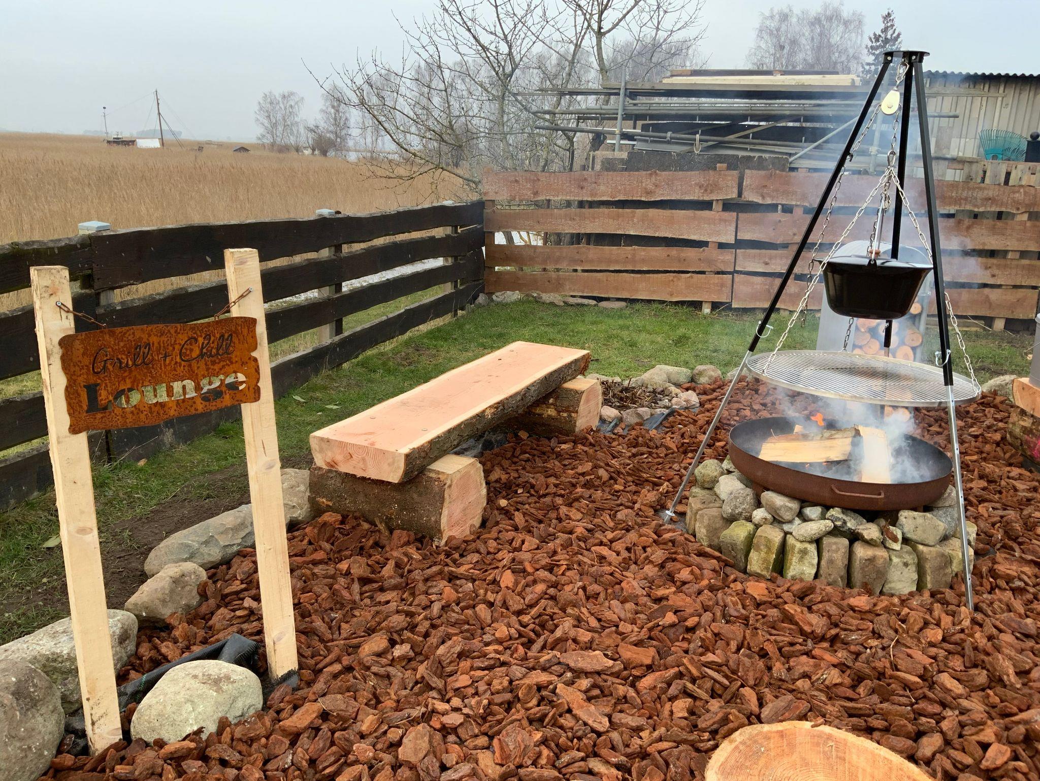 Ein weiteres Highlight ist die urige Grill- und Chill-Lounge im Garten direkt am Peene-Strom. Hier stehen Ihnen zwei Feuerschalen, Stockbrotspiesse, ein grosser Gulaschtopf und ein Grillrost zur Verfügung. Hier oder auf der danebenliegenden Terrasse können Sie Ihre gemütlichen Grillabende verbringen.