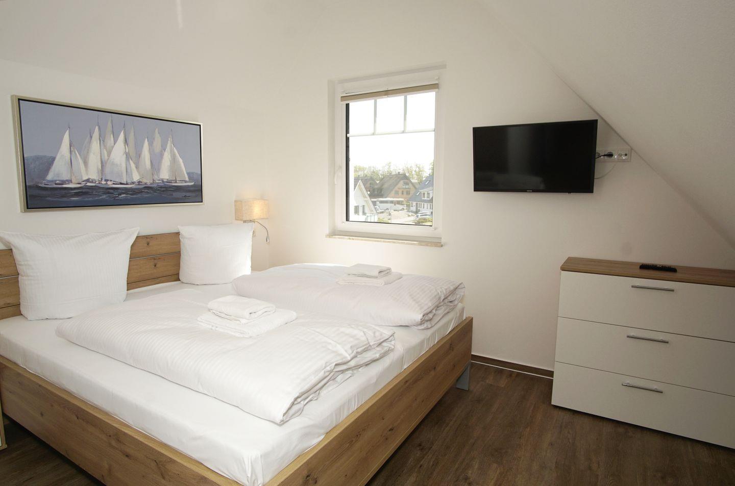 SCHLAFEN // Zwei Schlafzimmer jeweils mit bequemem Doppelbett und Smart-TV, ein Schlafzimmer mit einem Einzelbett, Schreibtisch und Smart-TV,