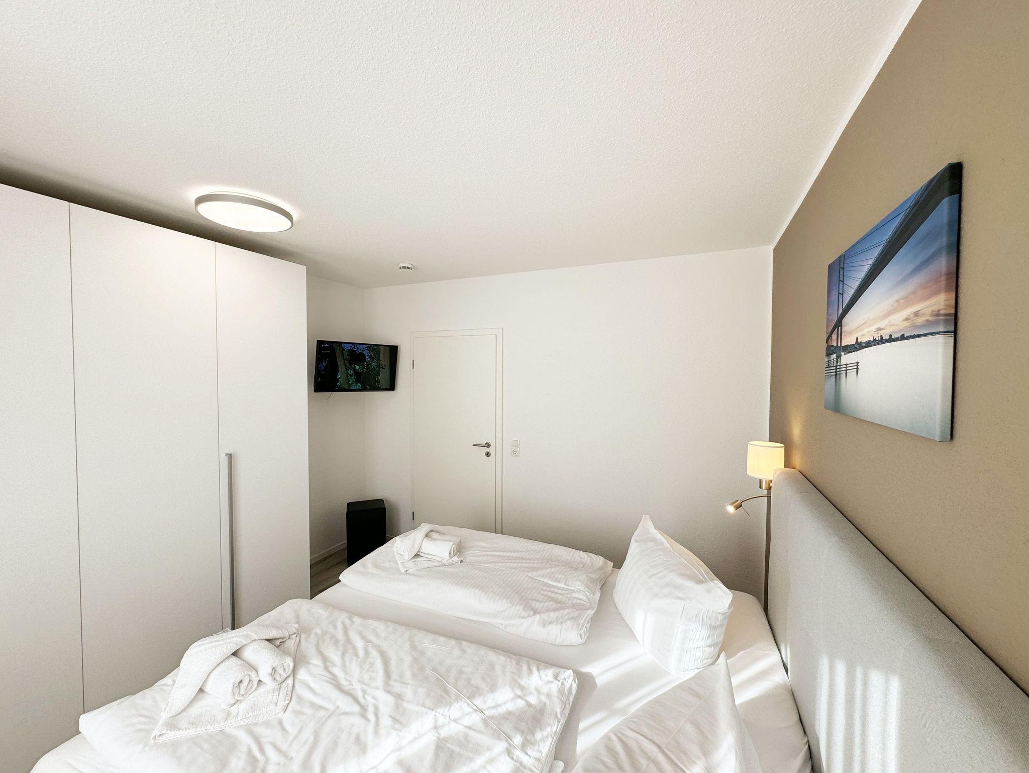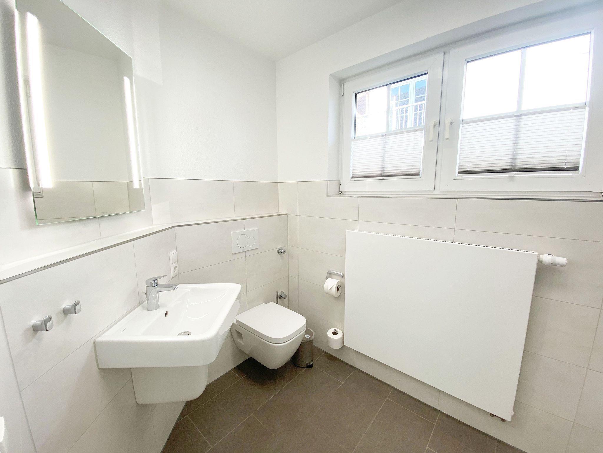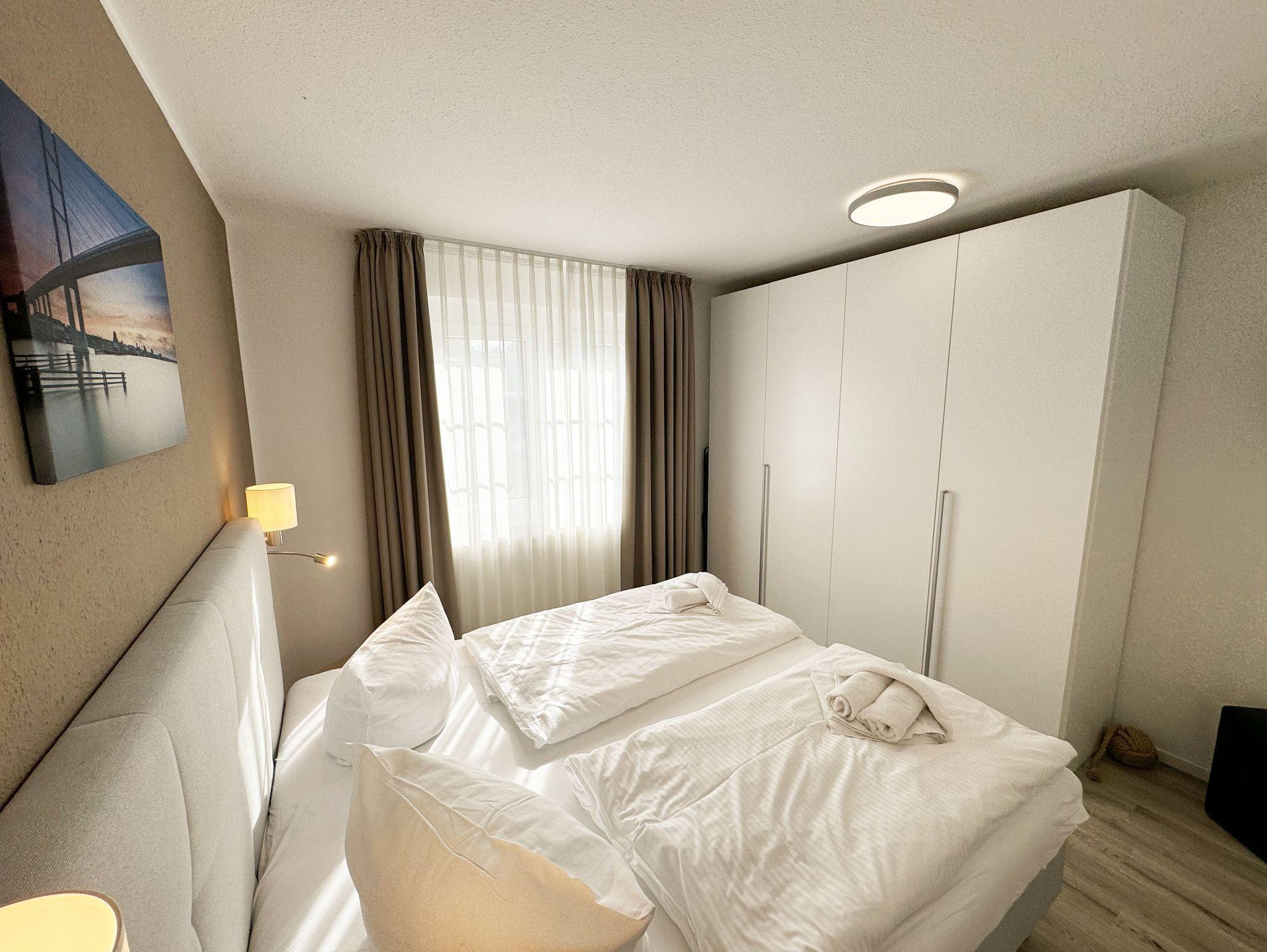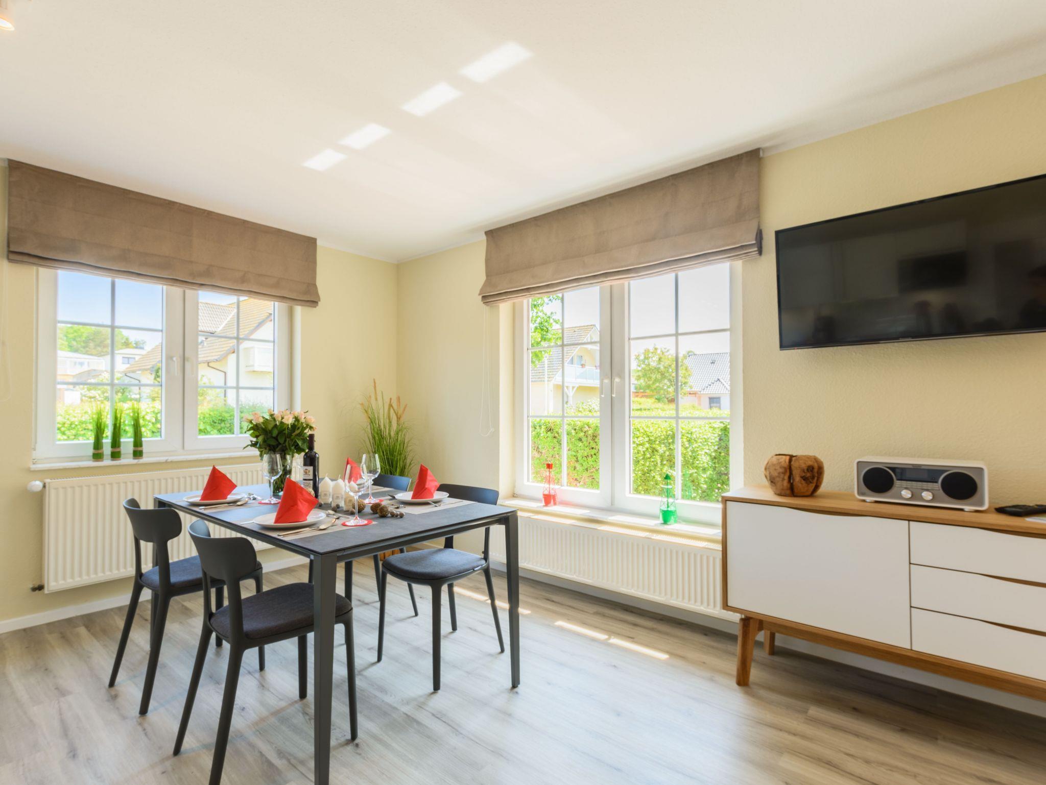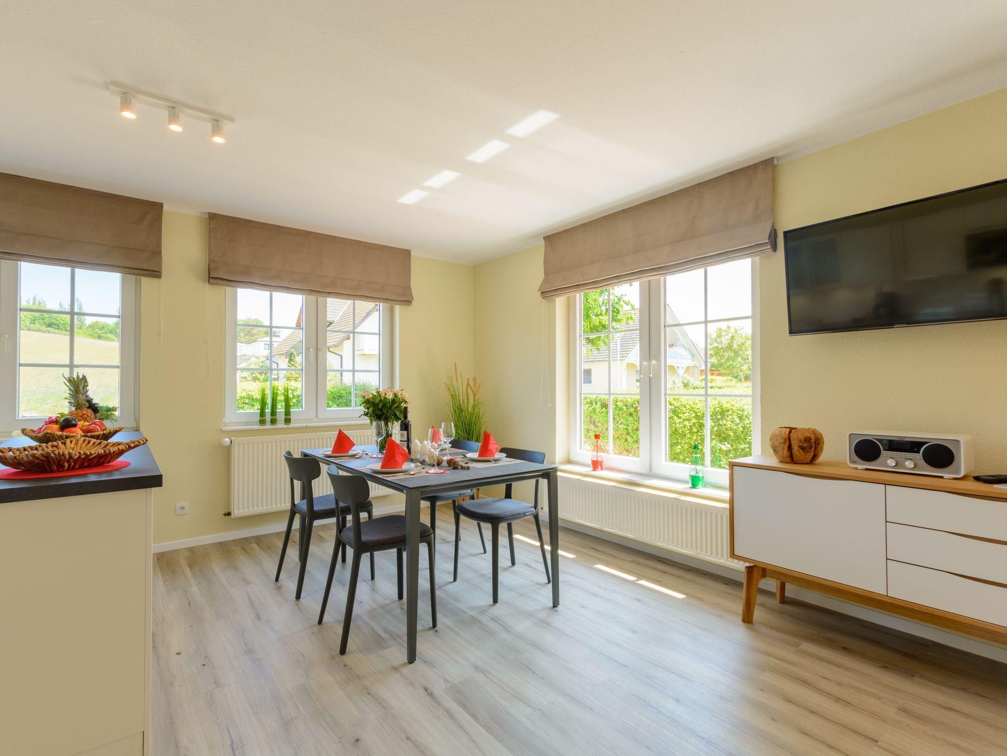 Die Nichtraucherferienwohnung befindet sich im Erdgeschoss und erstreckt sich über ca. 60 qm wo sich max. 4 Erwachsene wohlfühlen können. Der großzügige und helle Wohn- Essbereich ist mit einer modernen Küchenzeile ausgestattet. Mit einem Kühlschrank mit Eisfach, Geschirrspüler, Cerankochfeld, Backofen, Mikrowelle, Wasserkocher, Kaffeemaschine, Toaster, Mixer, Waffeleisen können Sie Ihre gemütlichen Kochabende ganz individuell gestalten. Ein passender Essbereich rundet die Gemütlichkeit ab. Im angrenzenden Wohnbereich trägt eine bequeme Couch (Aufbettungsmöglichkeit für 3./4.Person, 1,50m x 1,95m) mit Couchtisch, ein Lesesessel mit Hocker sowie ein TV-Board zu Ihrer Entspannung bei. Die technische Ausstattung umfasst einen Smart-TV, ein DAB-Bluetooth-Radio sowie einen WLAN-Anschluss. Vom Wohnbereich gelangen Sie auf Ihre bestuhlte Terrasse (Süd) mit Sonnenschirm, von wo Sie aus Ihren Tag entspannt bei einem Glas Wein ausklingen lassen können. Hell und freundlich eingerichtet erwartet Sie ein gemütliches Schlafzimmer, mit einem komfortablen Boxspring-Bett (1,80m x 2,00m) mit 5 Zonen Tonnen-Taschenfederkern-Matratzen, Nachttischablagen, einen großzügigen Kleiderschrank sowie ein Smart-TV. Der Schlafbereich verfügt zudem über Vorhänge, die nahezu lichtundurchlässig sind und einen guten Sicht- und Sonnenschutz bieten. Für einen angenehmen Schlaf sorgen zusätzlich Insektenschutzgitter im Wohn- & Schlafbereich. Das Tageslicht-Badezimmer ist mit einer ebenerdigen Dusche, einem WC, einem Fön sowie einem Waschtisch ausgestattet. Im Nachbarhaus C können Sie eine Waschmaschine sowie einen Trockner gegen Gebühr nutzen. Hier stehen auch ein Bügelbrett und ein Bügeleisen zur Verfügung. In der Wohnung finden Sie zusätzlich ein Staubsauger, ein Besen mit Kehrset, ein Wäscheständer sowie ein Wäschekorb. Haustiere sind nicht erlaubt. Das Grillen auf dem ausgewiesenen Gemeinschaftsplatz lädt zu gemütlichen Abenden ein. Zur Entspannung lädt eine münzbetriebene Sauna mit kleinem Ruheraum im Untergeschoss von Haus B ein. Ihre Fahrräder können Sie begrenzt im Gemeinschaftskeller oder auf dem Grundstück abstellen. Ein PKW-Stellplatz steht Ihnen inklusive zur Verfügung. Die Erstausstattung eines Wäschepaketes (komplette Bettwäsche, 1 Duschhandtuch, 2 kleine Handtücher) können Sie bis 14 Tage vor Anreise gegen einen Aufpreis dazu buchen oder durch eigene ergänzen. Ab 2 gebuchten Paketen erhalten Sie einmalig 1 Geschirrhandtuch und 1 Duschvorleger hinzu.