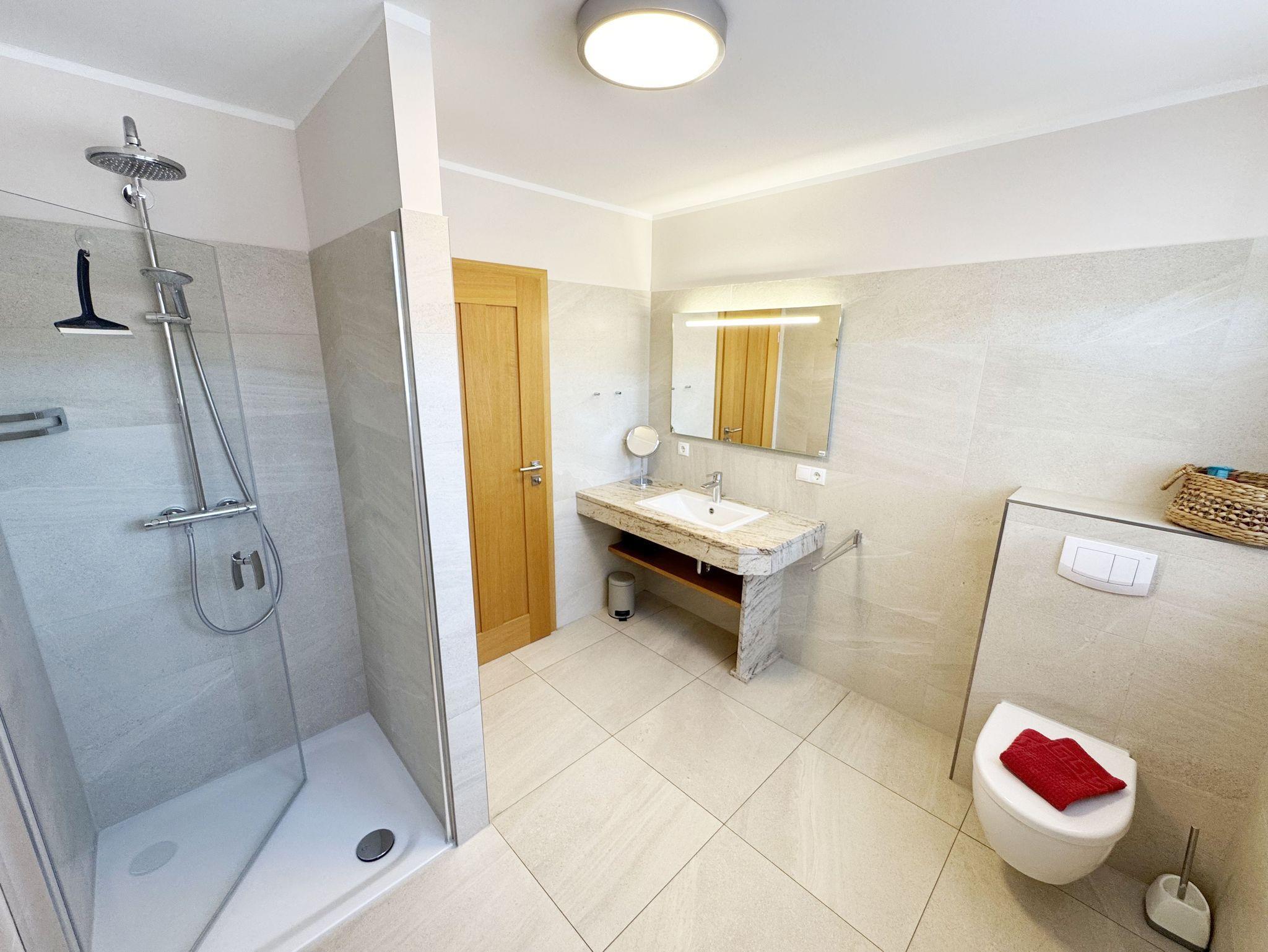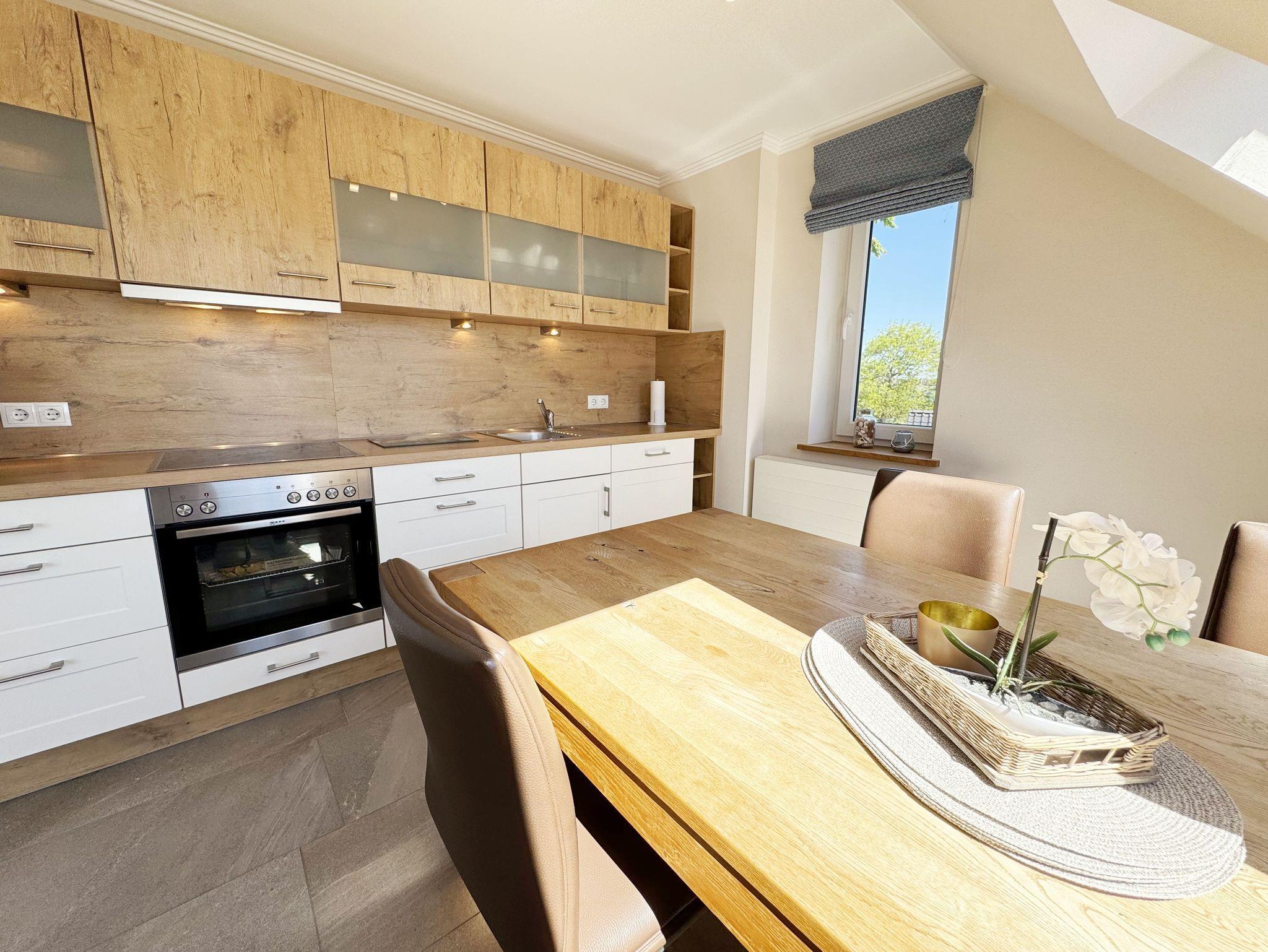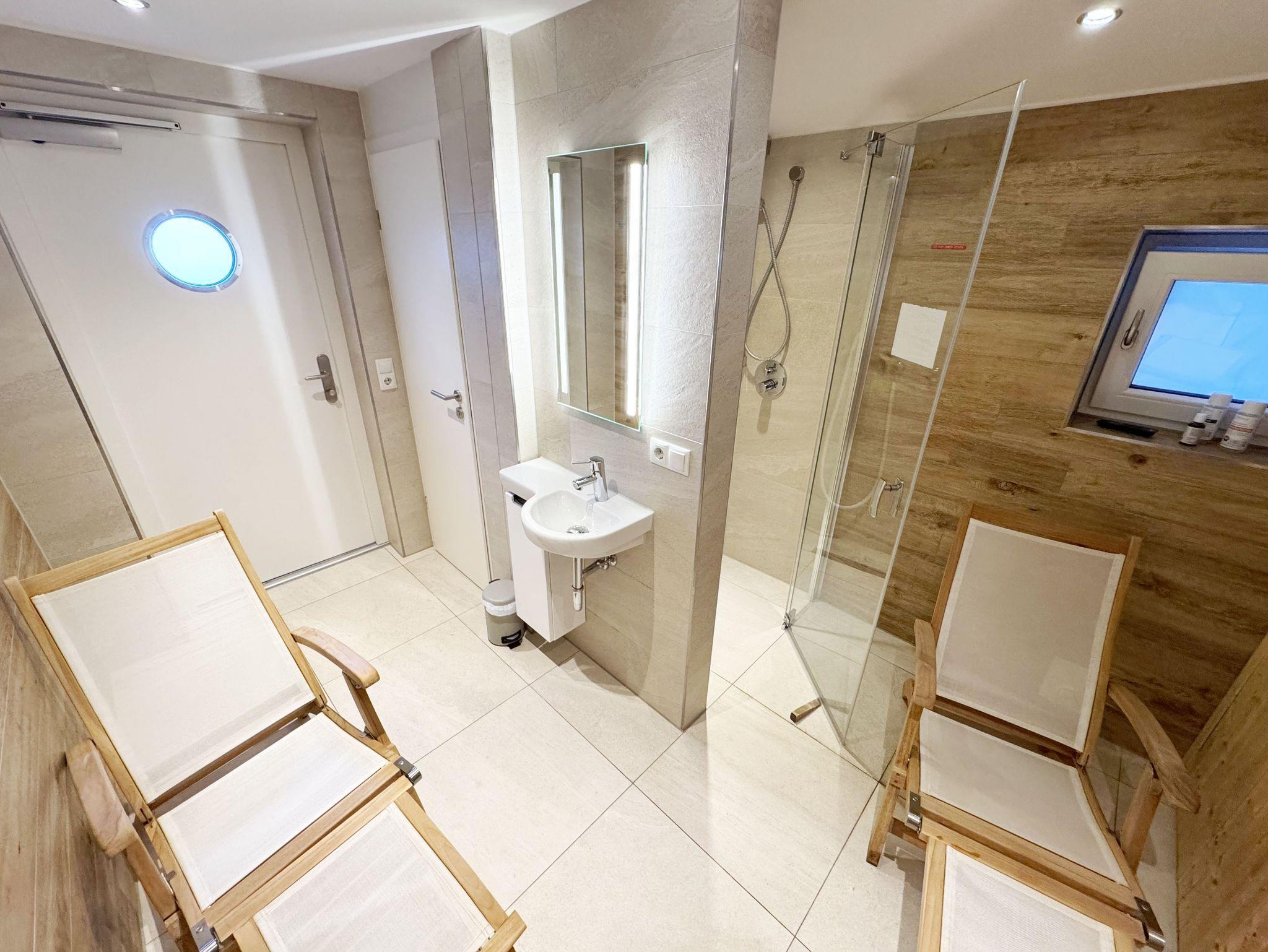 Die Ferienwohnung (Nichtraucher) Nr. 4, ca. 72,5 m², befindet sich im Obergeschoss eines 6 Familienhauses auf 4.500 m² großem Grundstück in Einzellage ohne Publikums- und PKW-Verkehr.Die Wohnung ist nach Süden ausgerichtet und verfügt über ein Badezimmer, ein verdunkelbares Schlafzimmer mit Doppelbett (Größe 1,80 m x 2,00 m) und Insektenschutz, einen ca. 35 m² großen Wohn- und Essbereich mit Schlafcouch (1,80m x 2,00m) sowie über einen ca. 6 m² großen Balkon. Die Matratze des Doppelbettes hat die Härtegrade 2 und 3. Das ausziehbare Schlafsofa verfügt über eine hochwertige Kaltschaummatratze. Von hier eröffnet sich ein grandioser Panoramablick über die unmittelbar vor dem Haus liegende Ostsee. Die einzigen Geräusche sind der Wind und das Rauschen des Meeres. Die Wohnung kann mit bis zu 2 Erwachsenen + 2 Kinder bis 15 Jahre belegt werden. Sie erfüllt in ihrer Ausstattung höchste Ansprüche. Erlesene Baumaterialien und Einrichtungsgegenstände vermitteln ein Gefühl des Genießens von Luxus. Nur beispielhaft sei erwähnt, dass das Badezimmer mit Granitwaschtisch, Fön, Fußbodenheizung und Handtuchheizkörper eingerichtet ist. In dem Flur und dem Wohn/Schlafraum sind hochwertige italienische Lake-Stone-Fliesen verlegt worden. Die moderne Küche beinhaltet einen Backofen mit Ceran-Kochfeld, Kühlschrank mit Gefrierfach und Geschirrspülmaschine. Die Küchenausstattung enthält an Kleinelektrogeräten Toaster, Kaffeemaschine, Wasser- und Eierkocher sowie Handmixer. Der Essbereich ist möbliert mit einem massiven Tisch aus geölter Wildeiche und Lederschwingstühlen in der Farbe mocca. Flachbildfernseher, Internetanschluss WLAN sowie Mini-Stereo Anlage mit USB sind vorhanden. Eine original finnische Sauna mit moderner Dusche und Ruheliegen steht allen Gästen gegen Gebühr zur Verfügung. Der Balkon ist mit komfortablen Möbeln für ein Genießen von Sonne, der nahen See und einem gemütlichen Beisammensein ausgerichtet. Die Parkplätze und ein überdachter Fahrradunterstand stehen kostenlos zur Verfügung. Ein ca. 3.000 m² großes Rasengrundstück, am Haus und an der Ostseeküste gelegen, steht zur Freizeitgestaltung mit Grillplatz zur Verfügung. Für unsere kleinen Gäste steht 1x Kinderreisebett (ohne Zusatzmatratze, ohne Bettinlett) und 1 Hochstuhl inklusive bereit. Haustiere sind nicht erlaubt. Die Erstausstattung eines Wäschepaketes (komplette Bettwäsche, 1 Duschhandtuch, 2 kleine Handtücher, 2 Geschirrhandtücher) können Sie bis 14 Tage vor Anreise gegen einen Aufpreis dazu buchen oder durch eigene ergänzen.