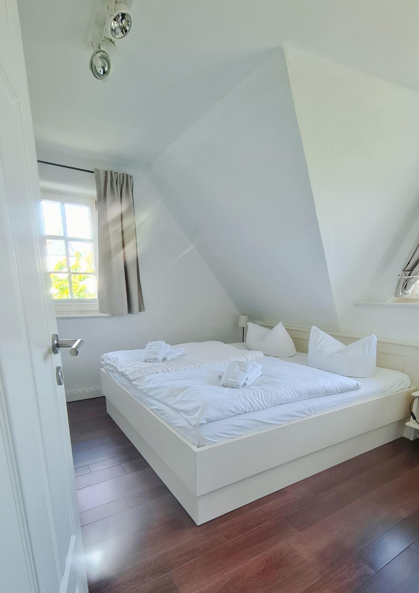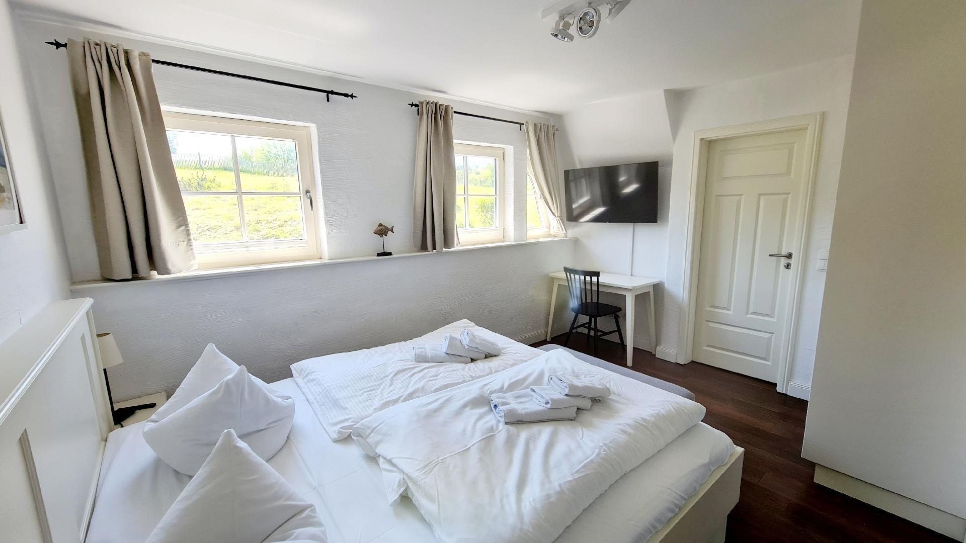 At the very top under the roof of the house is another spacious bedroom with "open beams". The spacious bedroom is furnished with a double bed and Smart TV, a seating area and a workstation.