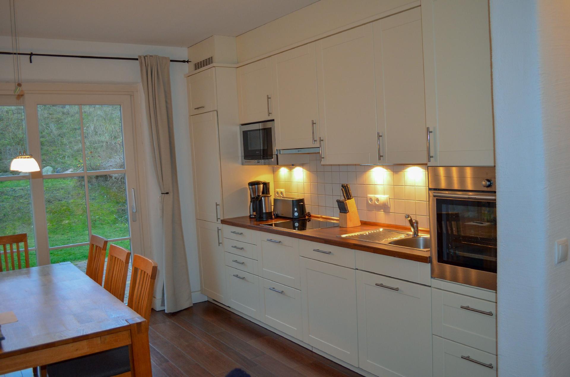 The open and fully equipped country-style kitchen with floor-to-ceiling windows and large dining table is ideal for cooking with family or friends. From here you have direct access to the south-facing terrace and the garden to enjoy an undisturbed breakfast or simply relax in the Rügen sunshine.