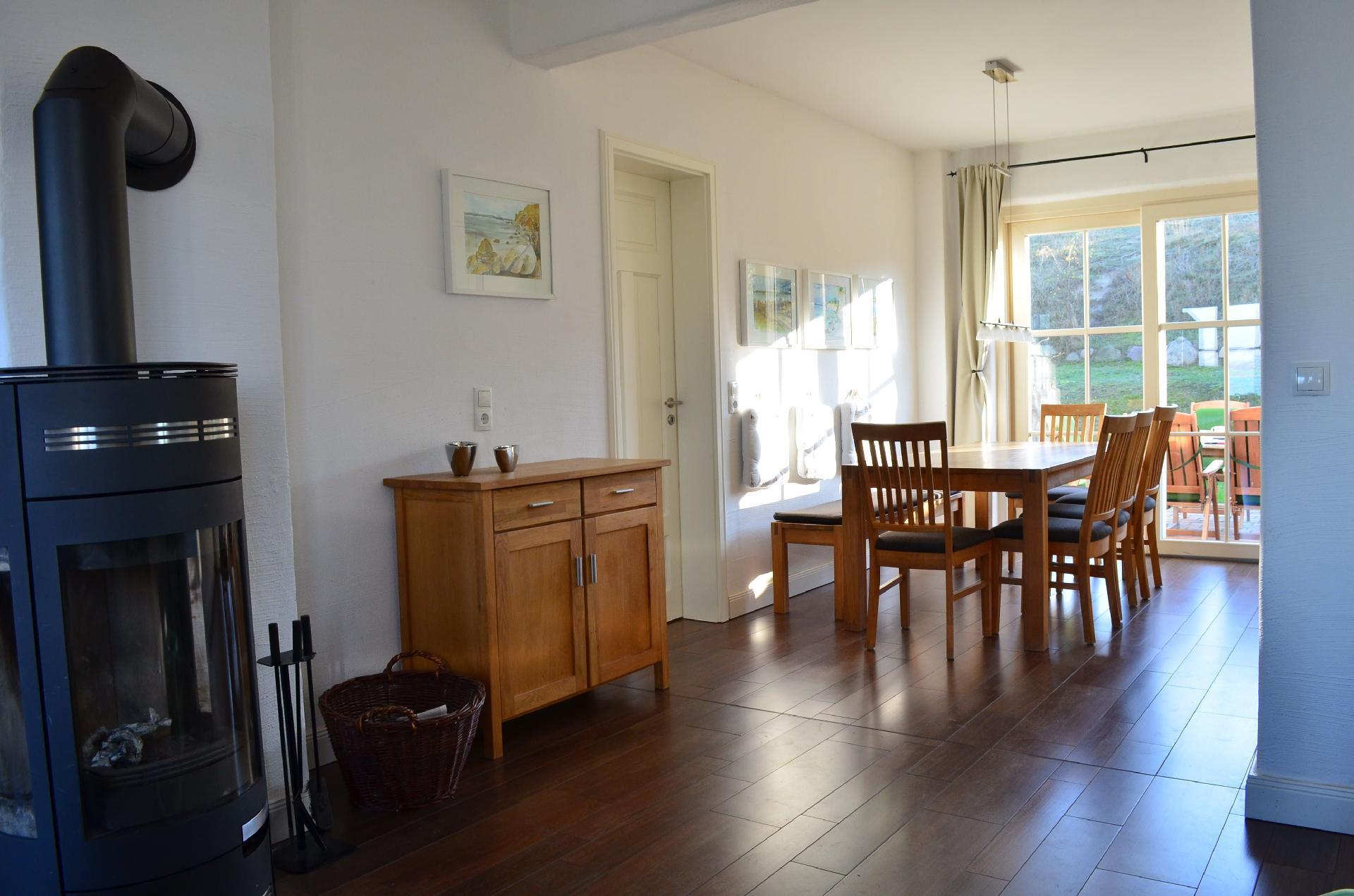 The cosy living area is equipped with a fireplace, large Smart TV and stereo system for family evenings together. From the living room you have direct access to the west terrace with a view of the Bodden and for particularly beautiful and romantic sunsets over the water.