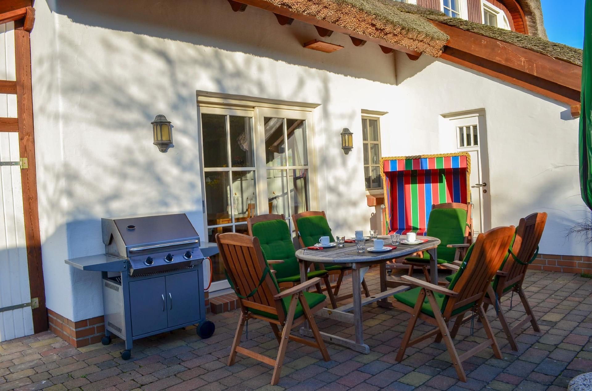 The outdoor area has been lovingly landscaped and is surrounded by a frieze wall with hedge roses. Enjoy the garden with two terraces and garden furniture (May-October) with your own beach chair.