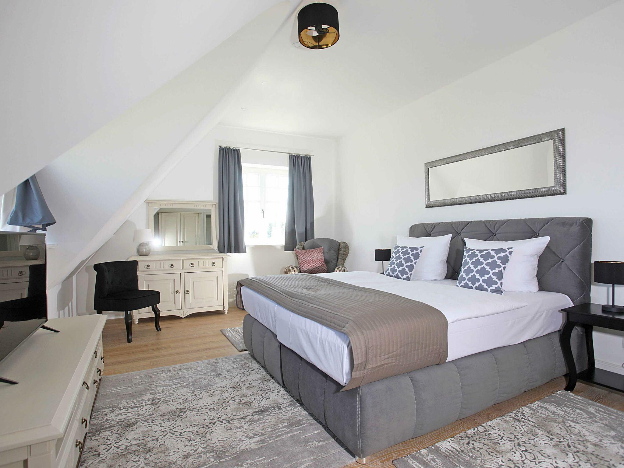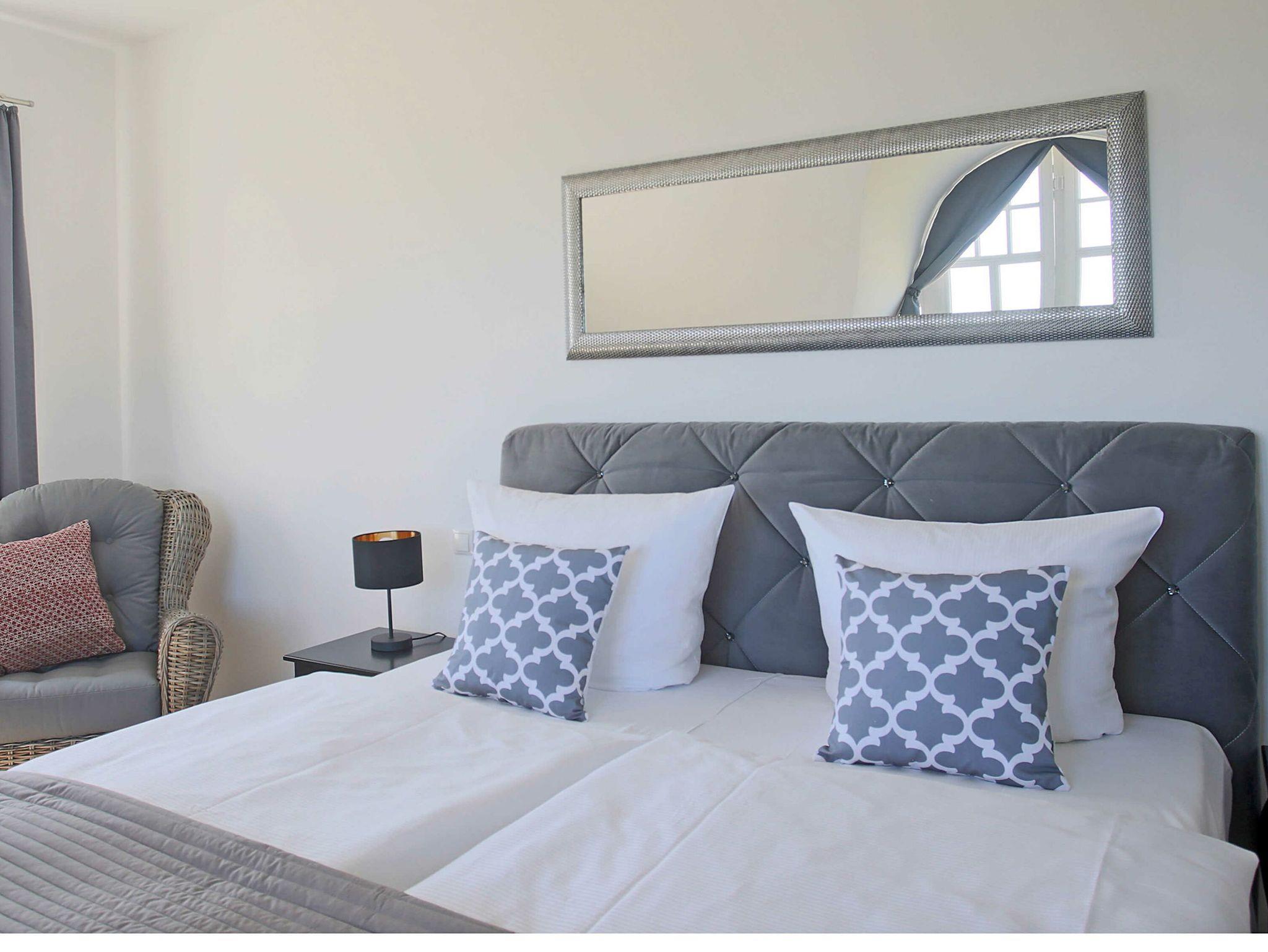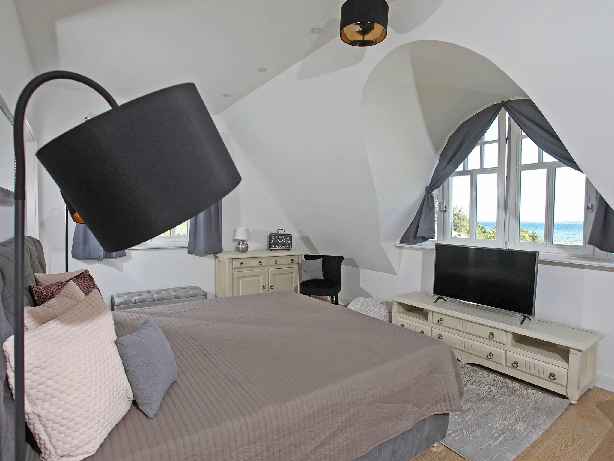 Über eine Treppe gelangen Sie in das außergewöhnlich schöne Obergeschoß. Hier erwarten Sie 3 Schlafzimmer - 2 davon mit einem Doppelbett (Box-Spring-Betten mit durchgehendem Topper) der Größe 180x200 cm sowie einem eigenen TV. Die beiden Schlafzimmer mit den Doppelbetten haben einen direkten Zugang zum jeweiligen Bad inklusive Meerblick.