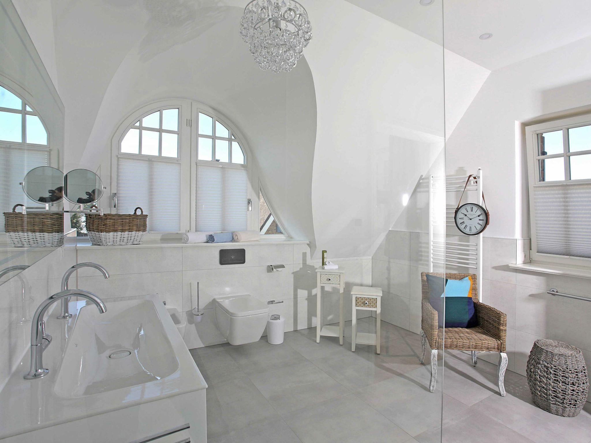Ein Bad ist mit einer großen Dusche, einem Doppelwaschtisch sowie einer freistehenden Badewanne ? mit tollem Meerblick- ausgestattet. Das weitere Bad verfügt über eine Dusche, ebenfalls mit einem Doppelwaschtisch.
