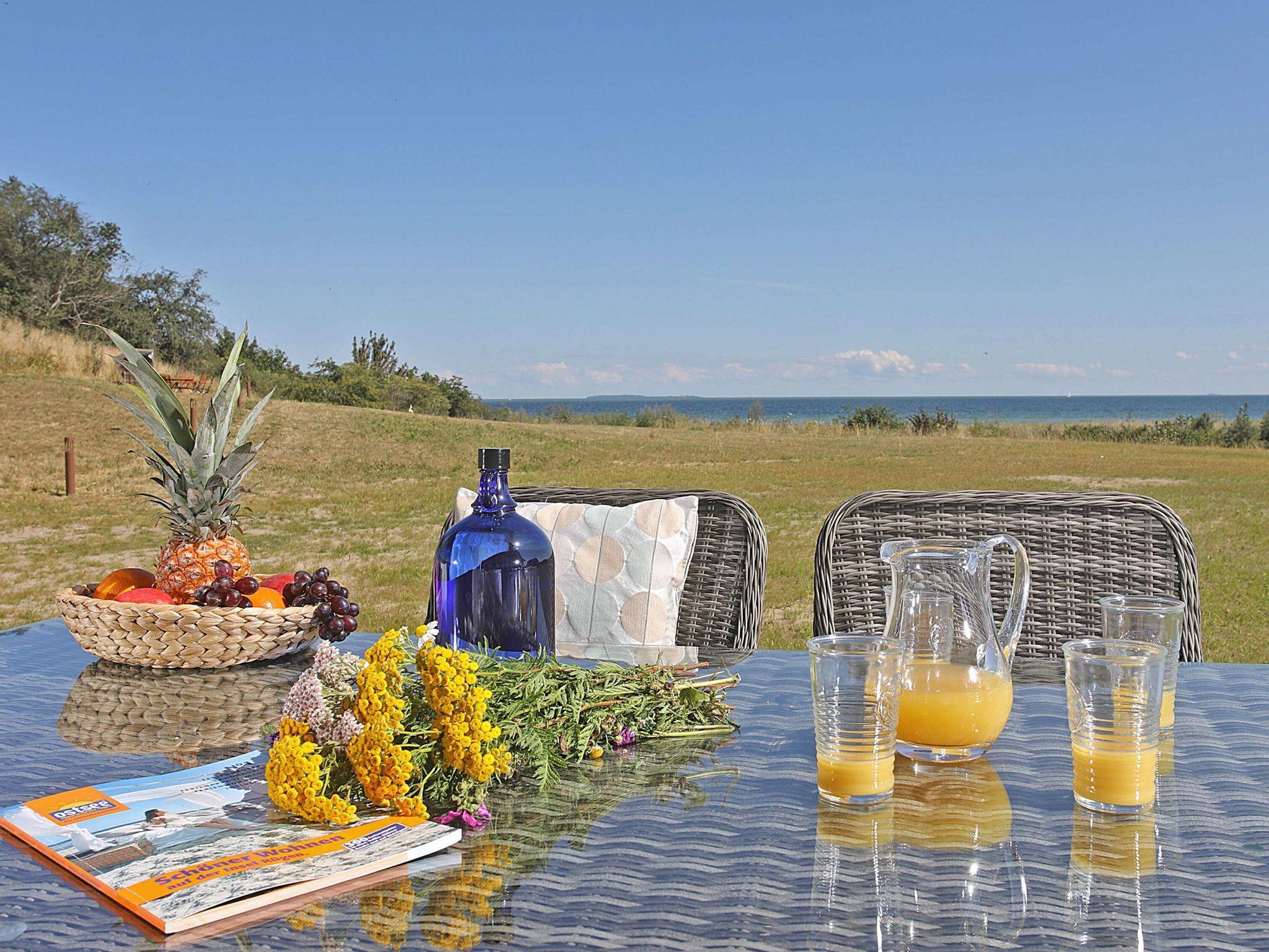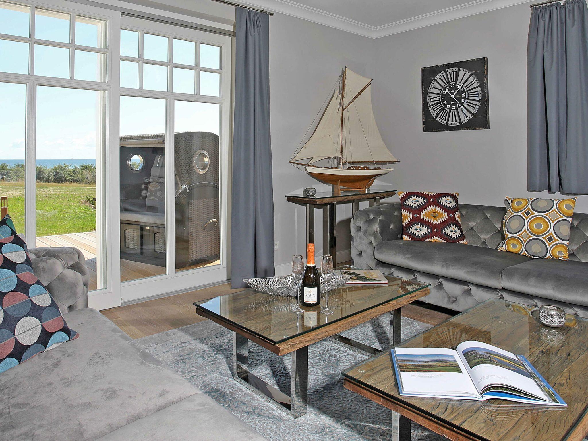 Der lichtdurchflutete Wohn- und Essbereich mit Meerblick befindet sich im Erdgeschoss. Das Wohnzimmer ist mit gemütlichen Sofas und einem LED UHD TV ausgestattet. In den kühleren Jahreszeiten verbreitet der, im Wohnzimmer eingebaute, Kamin eine besonders behagliche Atmosphäre.[nbsp] Die große integrierte Küchenzeile mit einem Backofen, einer Mikrowelle, einem Geschirrspüler, einem großen Kühlschrank mit Gefrierfach, einer Kaffeemaschine, Toaster, Wasserkocher und diversen Kleininventar lässt das Herz jeden Hobbykochs höher schlagen. Eine freistehende Kochinsel mit Sitzmöglichkeit rundet das Wohnküchenflair ab.