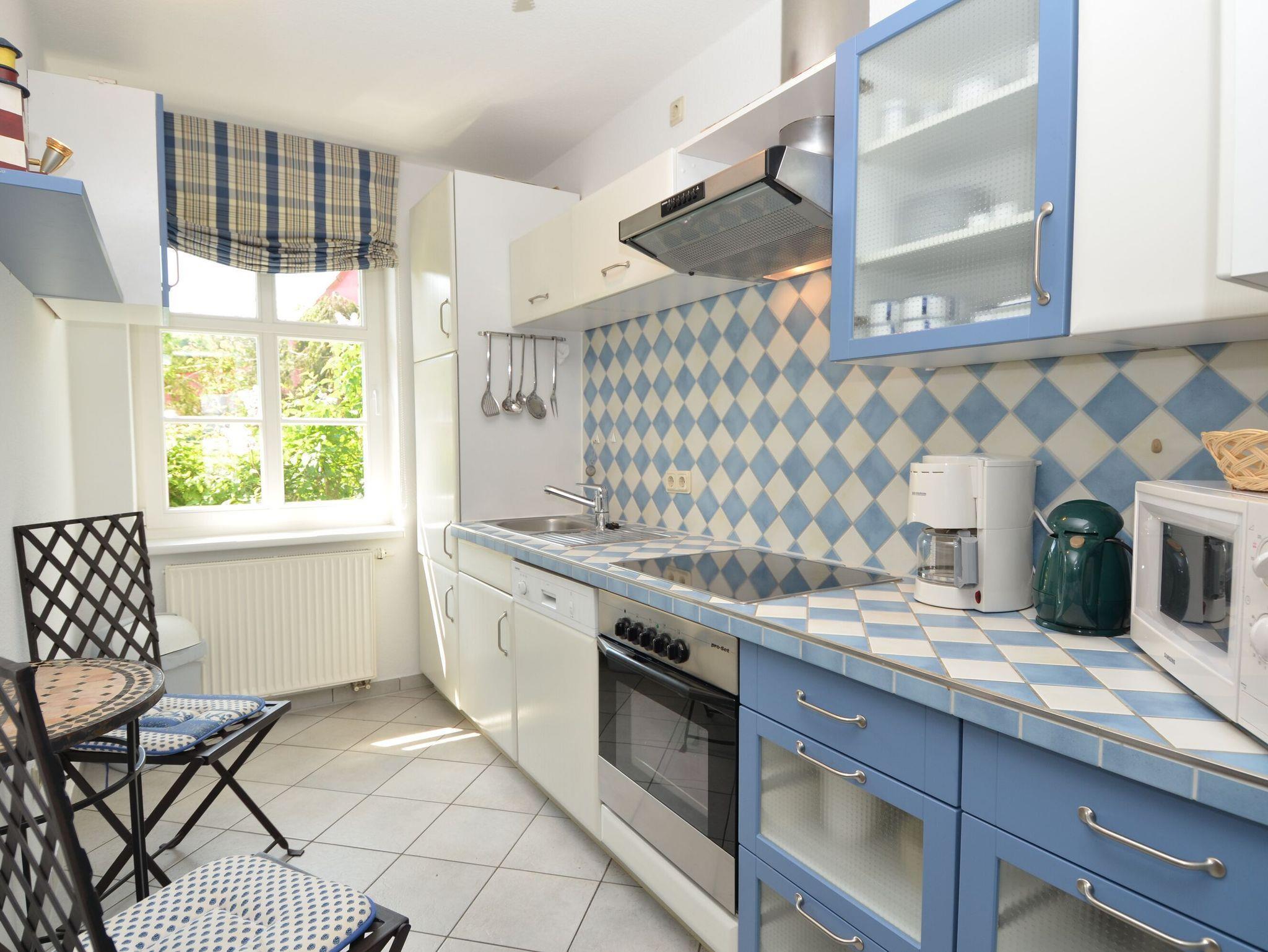 Die separate Küche ist komplett ausgestattet und enthält unter anderem einen Kühlschrank, ein 4-Platten-Cerankochfeld, Backofen, Geschirrspüler, Kaffeemaschine, Toaster, Wasserkocher und diverses Kleininventar. Ein Duschbad und zwei Abstellkammern - eine davon mit Waschmaschine und Trockner zur kostenfreien Nutzung - befinden sich ebenfalls im Erdgeschoss.