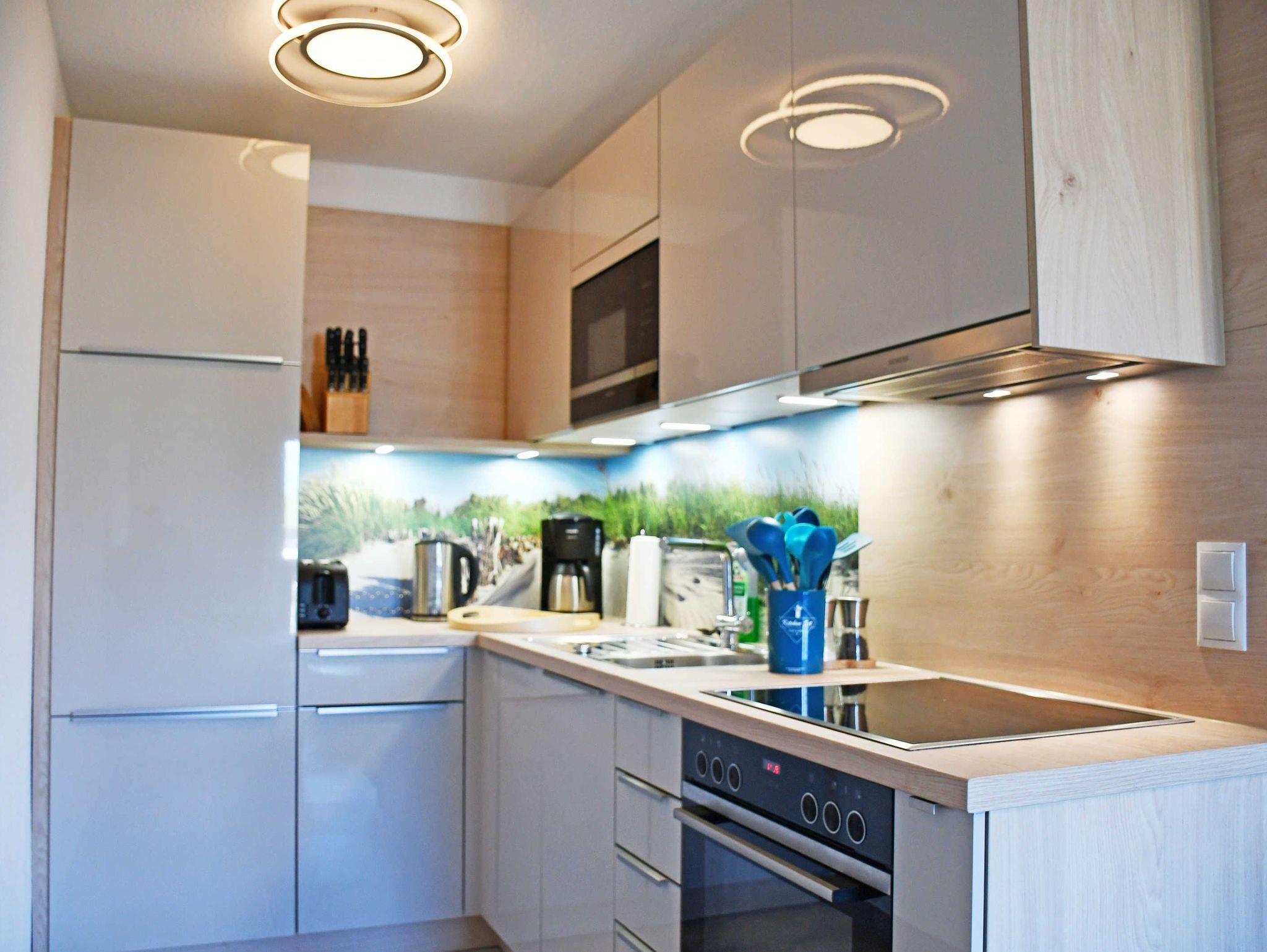 Im Wohnzimmer wartet die gemütliche Sofalandschaft mit Couchtisch und ein modernes Flachbild-TV-Gerät auf Sie zum Relaxen. Hier steht auch ein Esstisch mit fünf Stühlen. Kochfreunde werden in der neuen, hellen und modernen offenen Küche mit hochwertigen Markengeräten wie Backofen, Cerankochfeld mit Abzugshaube, Mikrowelle, Kühlschrank mit Gefrierfach und Geschirrspüler voll auf Ihre Kosten kommen.