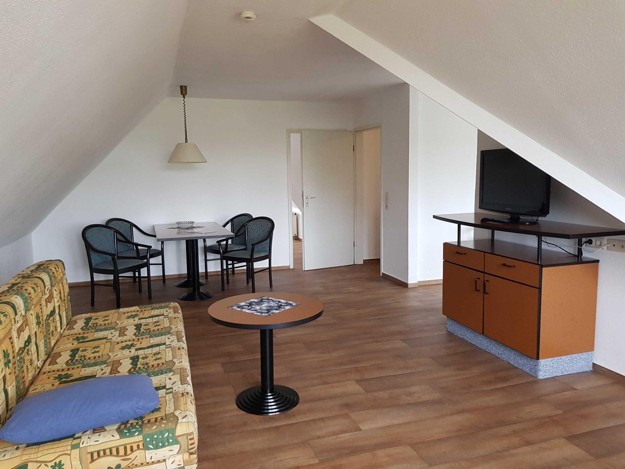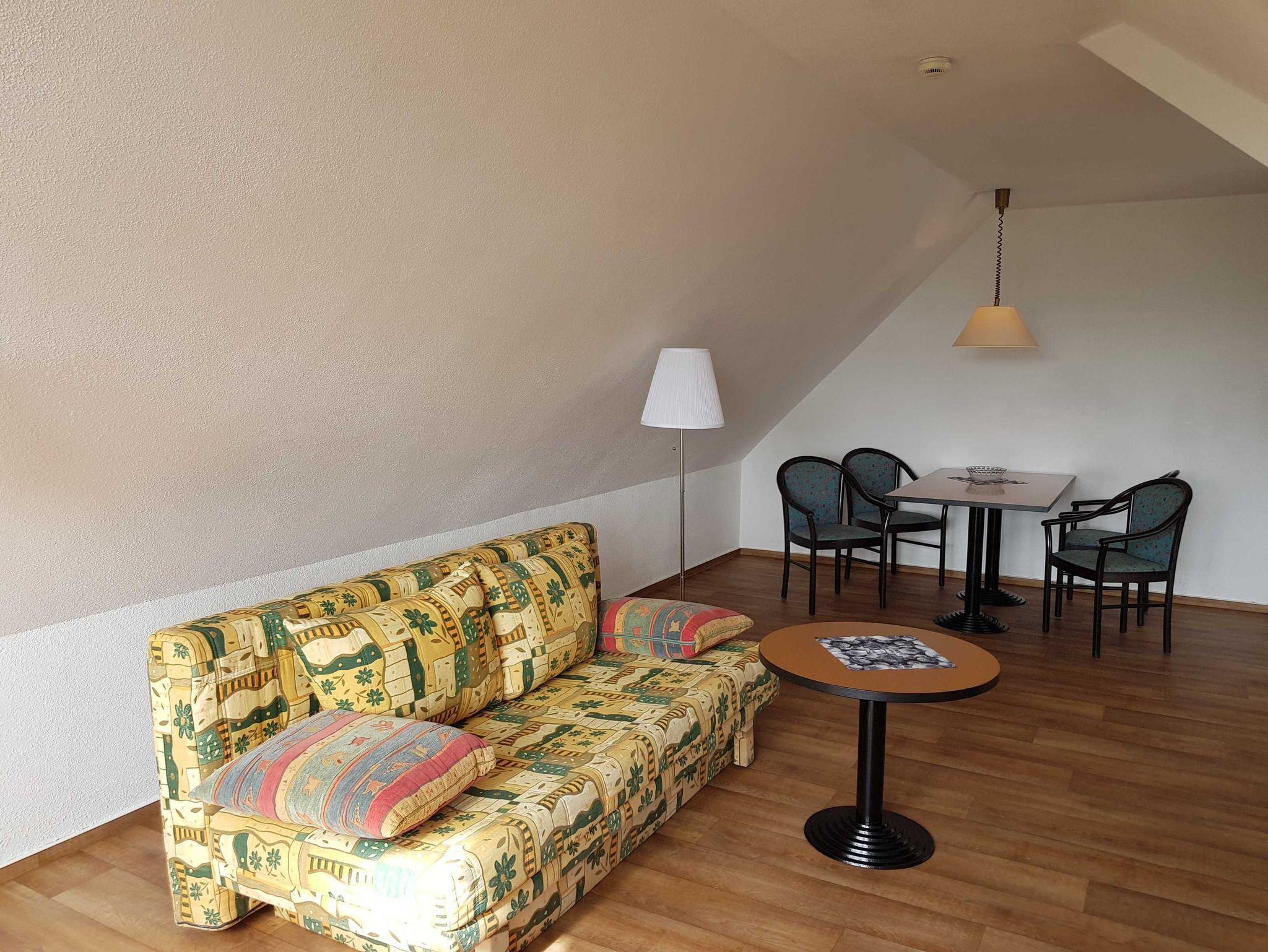 • Wohnzimmer mit ausziehbarer Couch und Esstisch für 4 Personen.