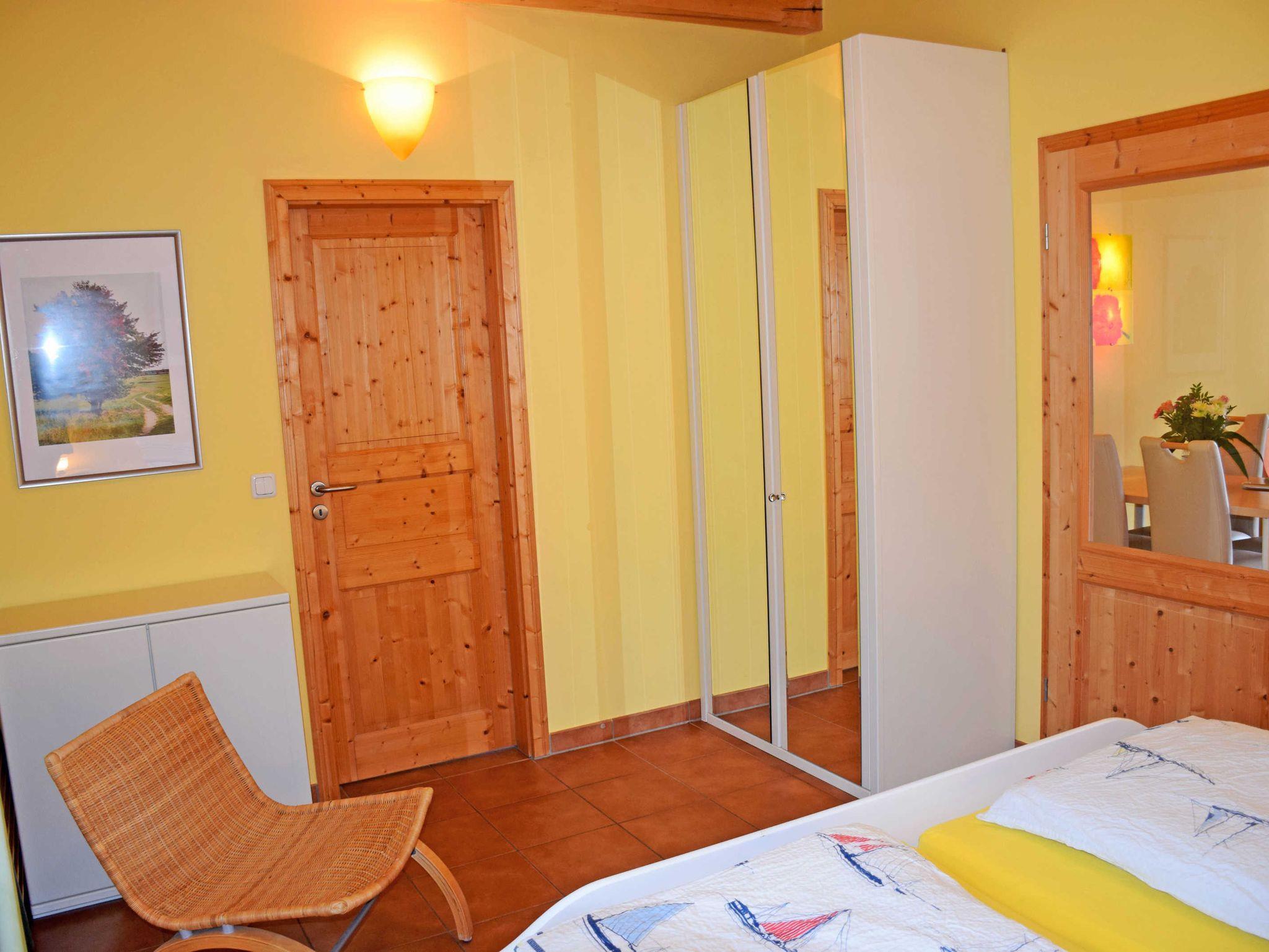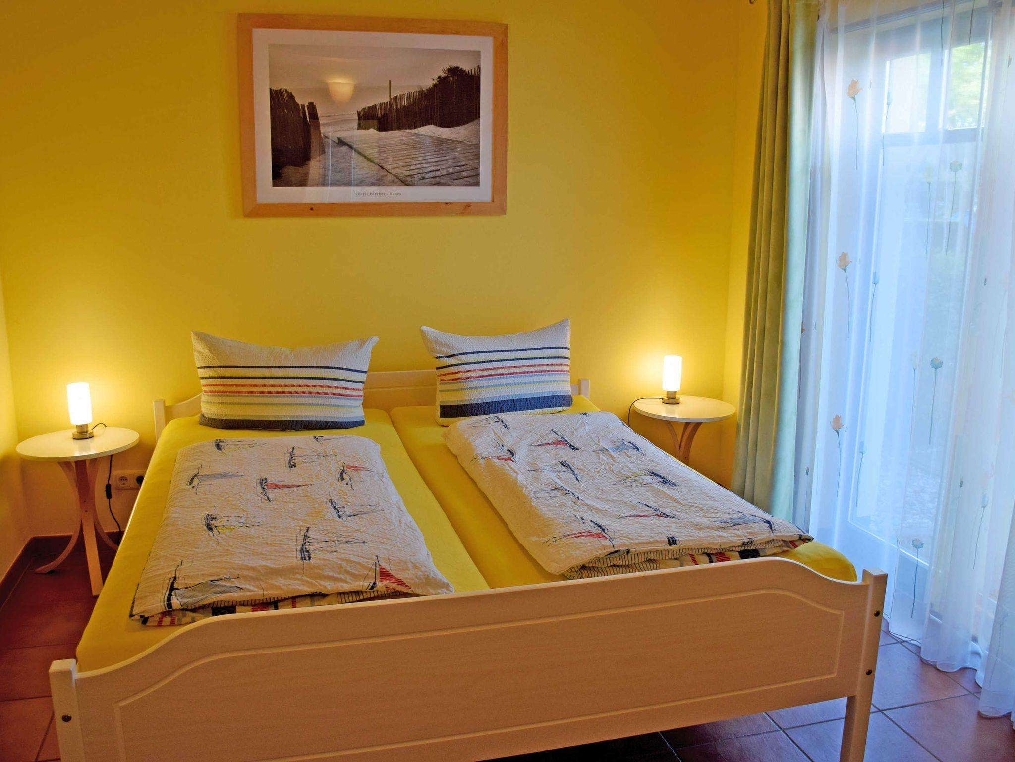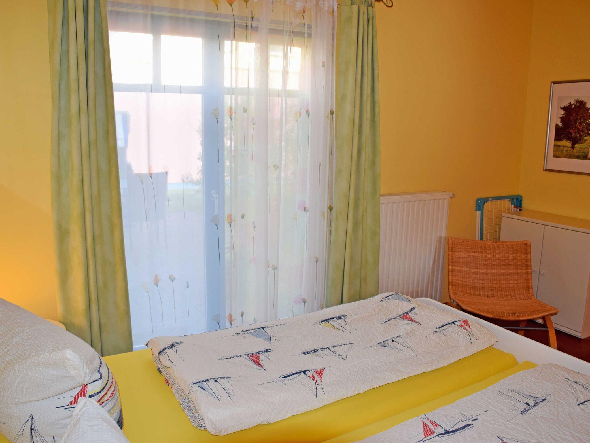 Das Schlafzimmer, ebenfalls im EG, verfügt über ein bequemes Doppelbett mit Nachttischen und Leselampen sowie Fliegengitter. Das schöne Bad ist mit Fenster, Dusche, WC sowie einem Waschtisch ausgestattet. Ein Kinderbettchen sowie ein Hochstuhl stehen Ihnen auf Anfrage bereit.