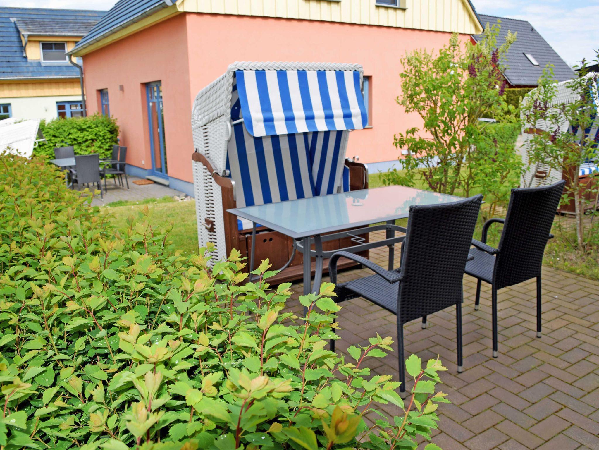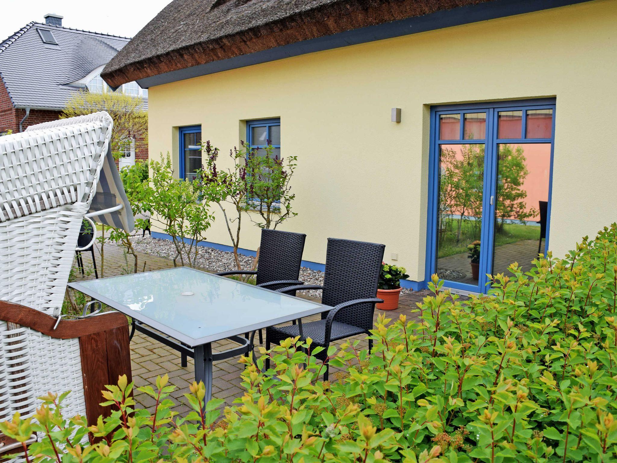 Vom Wohnbereich aus gelangt man auf die Terrasse mit Gartenmöbeln, Strandkorb und in den Gemeinschaftsgarten.
