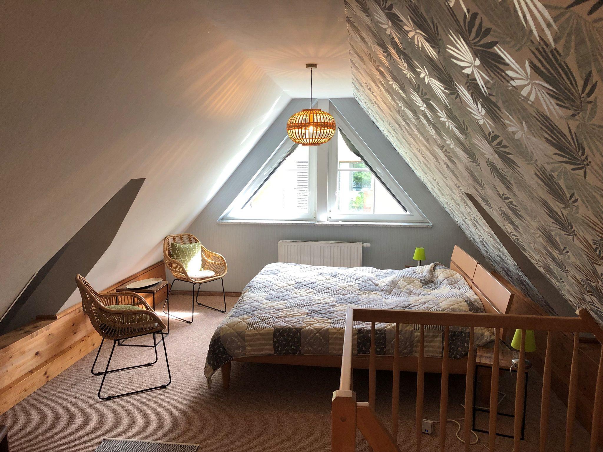 Im Obergeschoss und offenem Spitzboden haben Sie 3 Schlafzimmer mit insgesamt 6 Betten und ein weiteres Bad mit Dusche, WC, Waschtisch und Whirlpool.